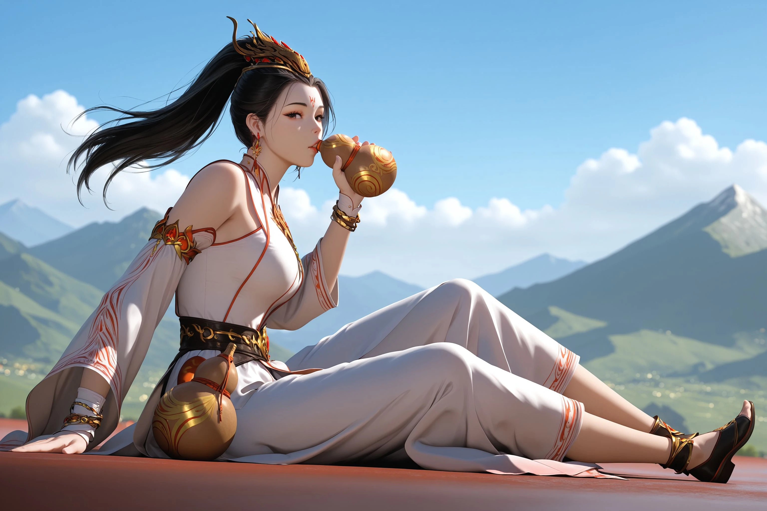 1girl, solo, jewelry, earrings, black hair, detached sleeves, bracelet, long hair, ponytail, dress, white dress, realistic, forehead mark