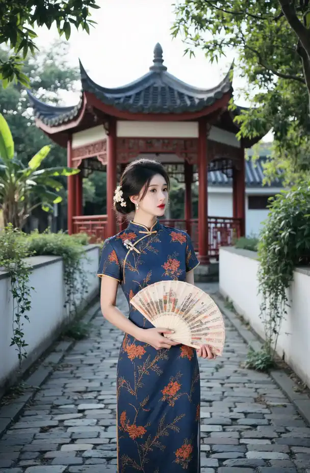 xqkk567, a woman in a blue floral cheongsam, holding a folding fan, stands on a cobblestone path in a chinese garden, while a dolly zoom is performed, the camera physically moves towards her as the lens zooms out, causing the background chinese pavilion and garden path to visually stretch and recede away, distorting the surrounding perspective.