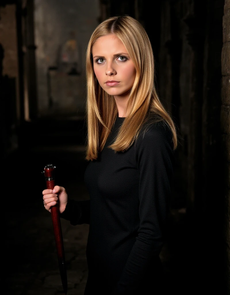 buffy, 1girl, realistic, blonde hair, long hair, blue eyes