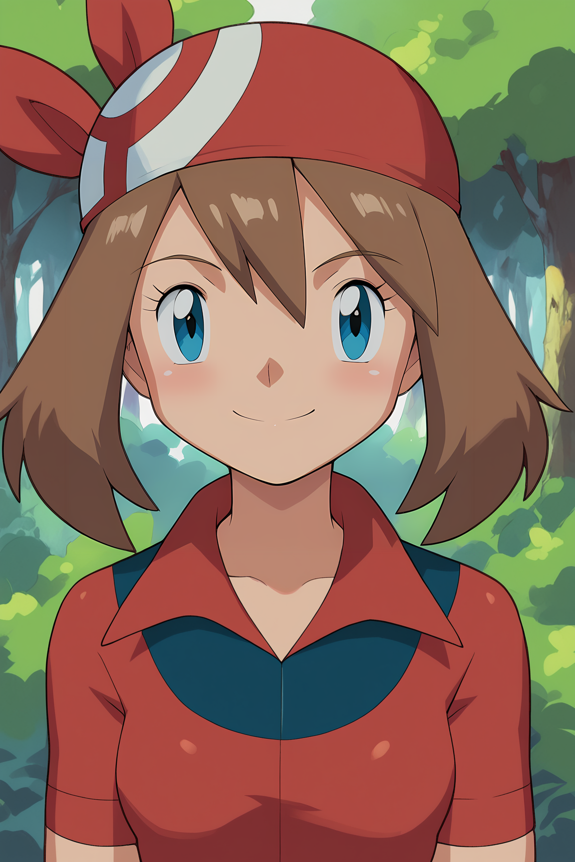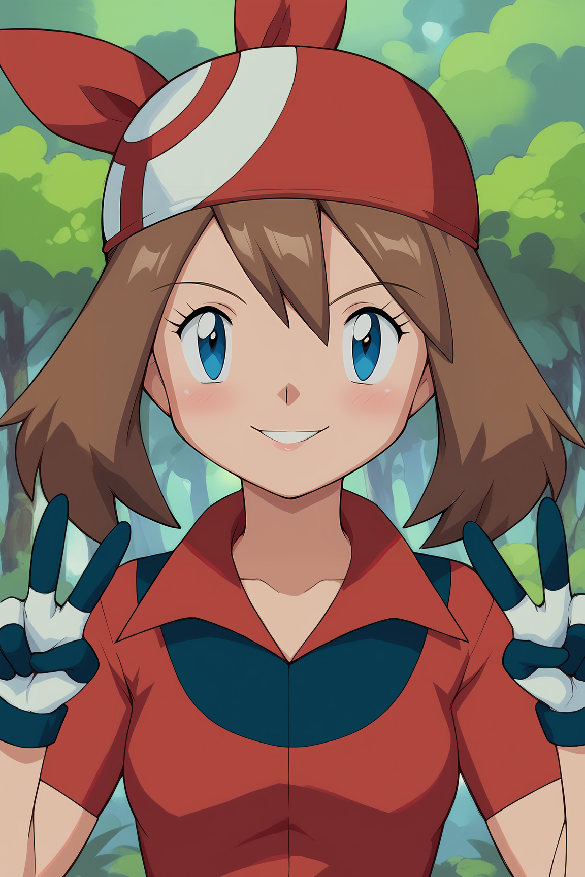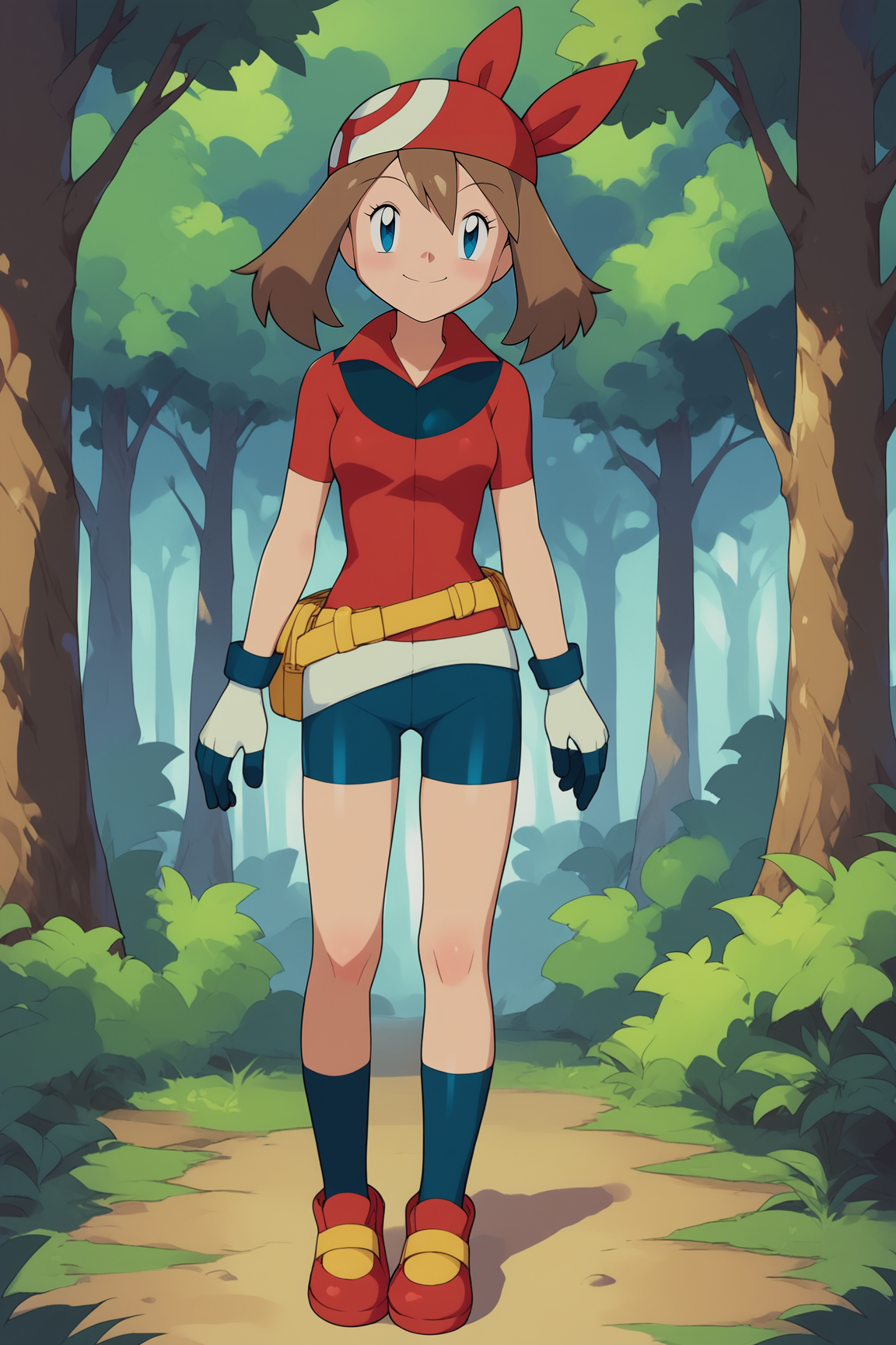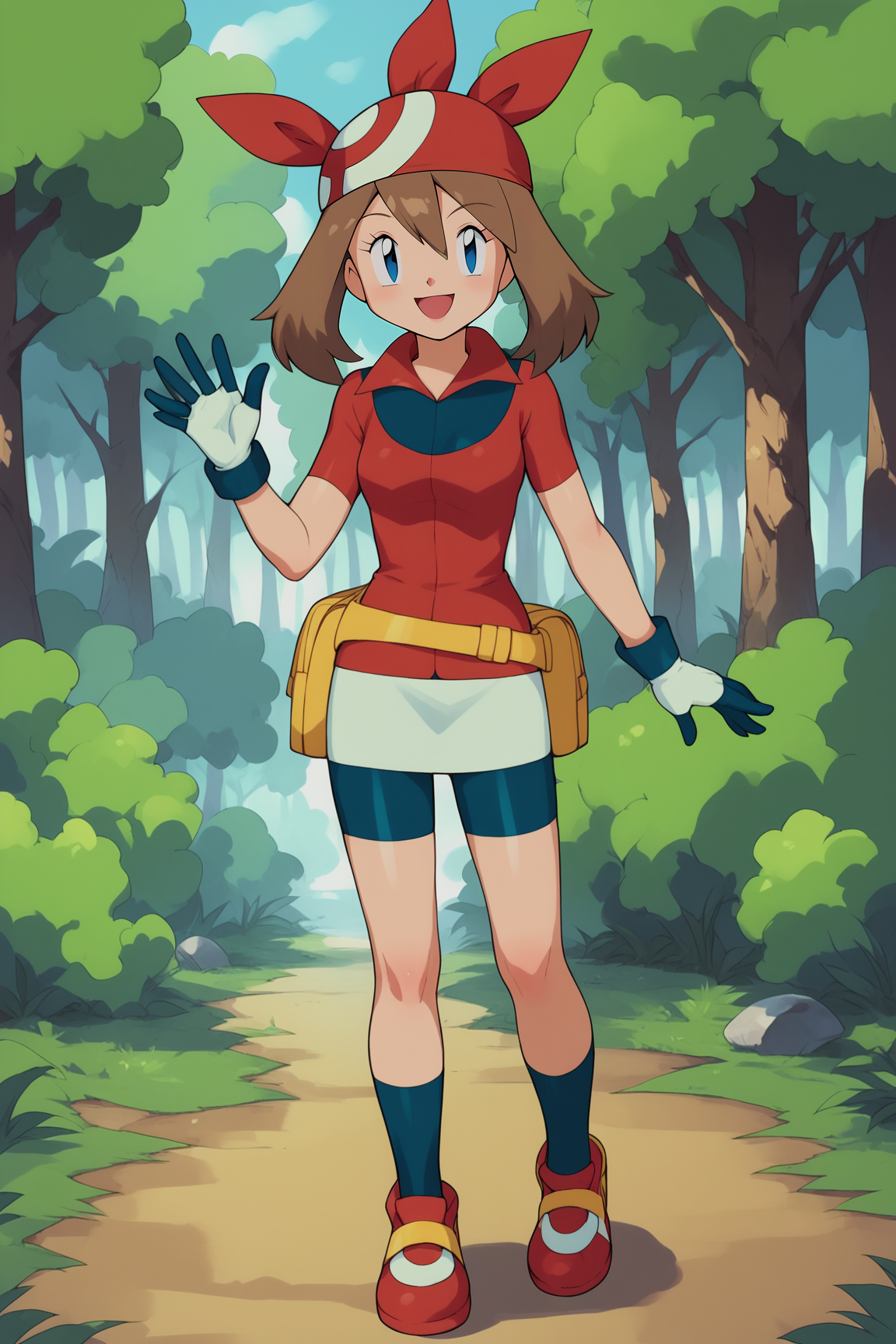 MayPXL, blue eyes, brown hair, short hair, hair between eyes, red bandana, small ???????, red shirt, short sleeves, gloves, white skirt, blue shorts, blue socks, red shoes