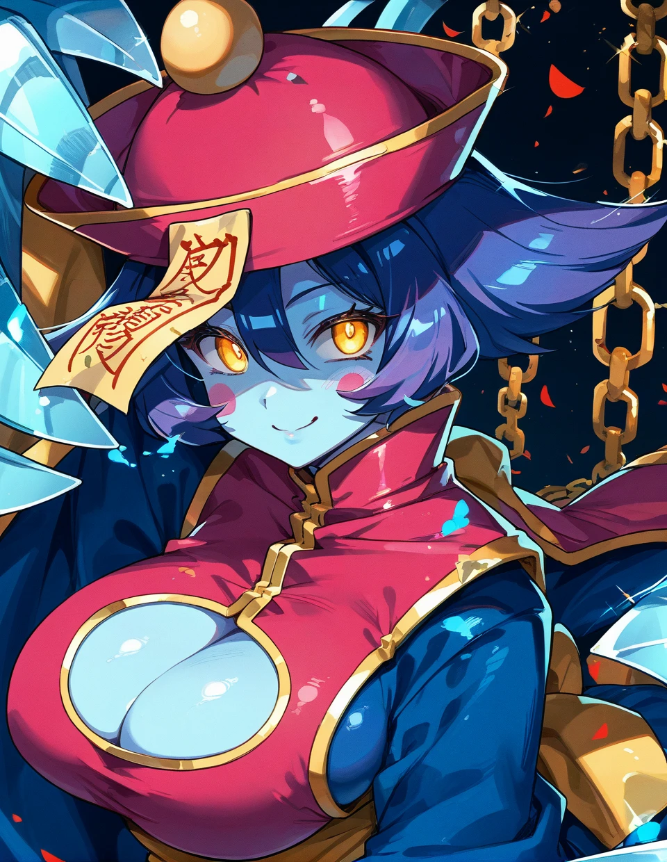 Recommended:jiangshi,purple hair,yellow eyes,blush stickers,blue skin