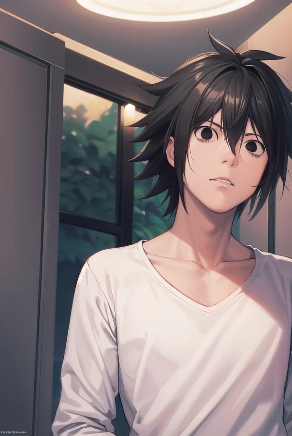 lawliet, male focus, spiked hair, (black eyes:1.5), black hair,