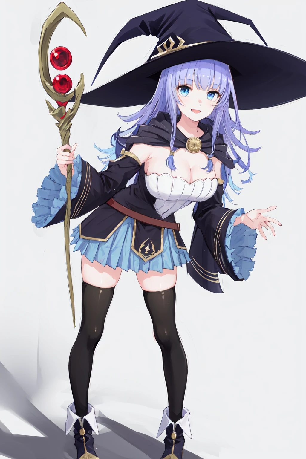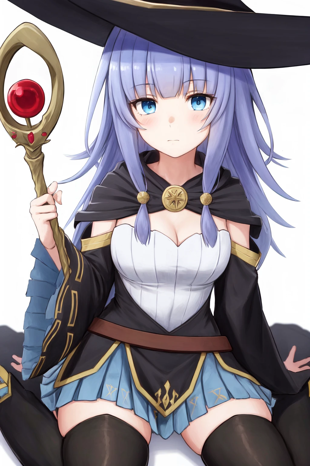 Default outfit: witch hat cape blue skirt black thighhighs boots detached sleeves wide sleeves
