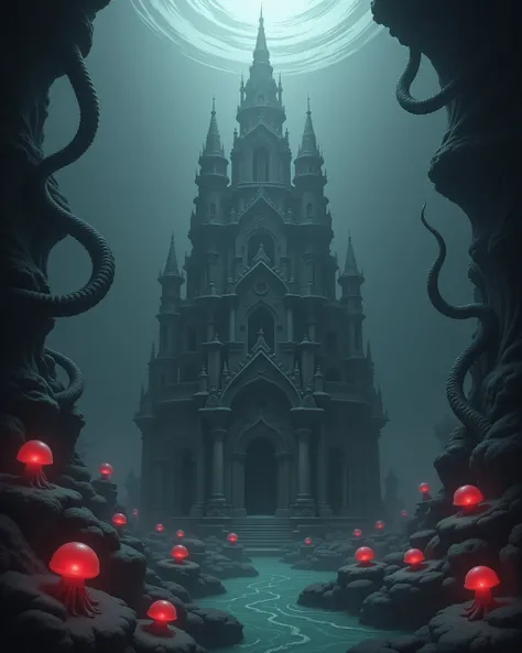 - a temple shaped like an alien tentacles, sitting on the ocean floor, surrounded by a coral reef