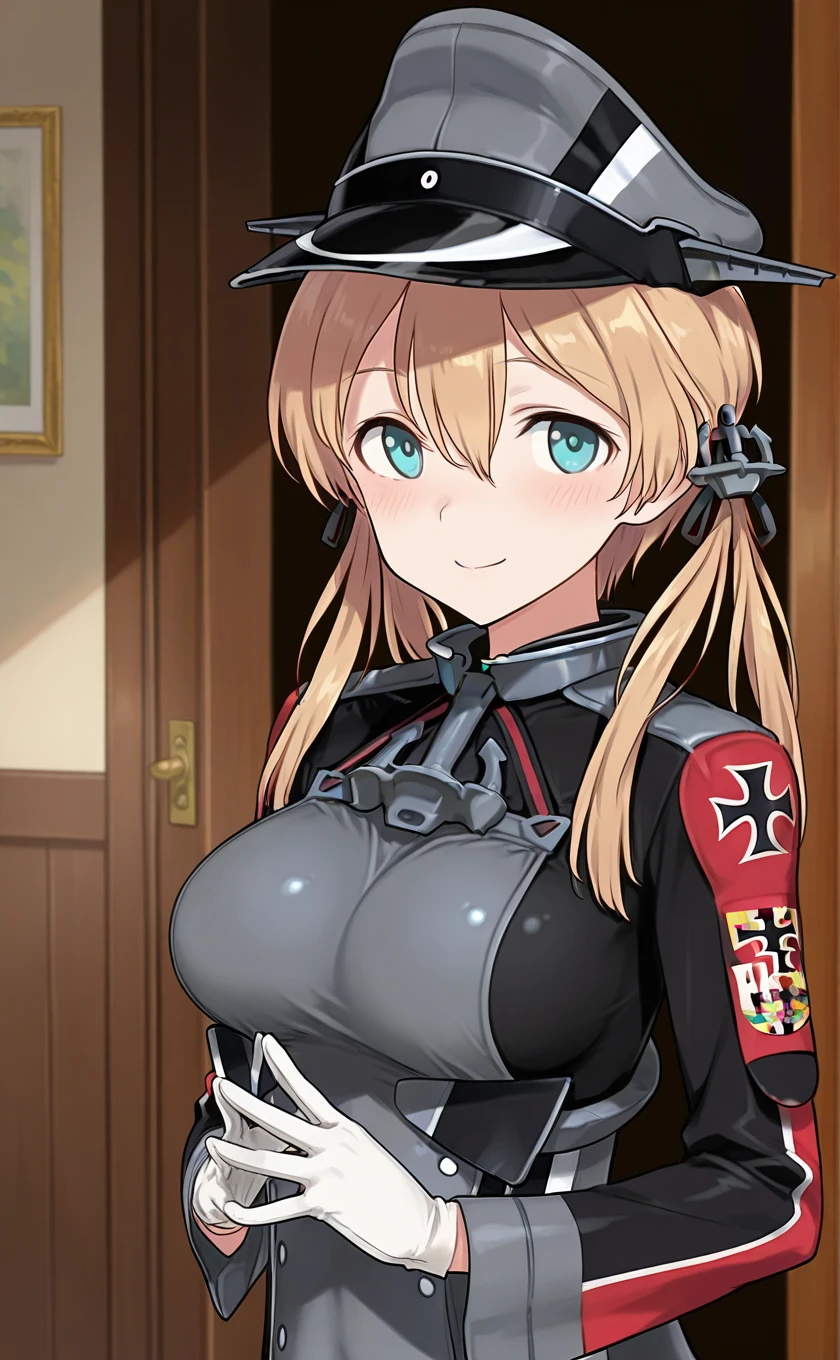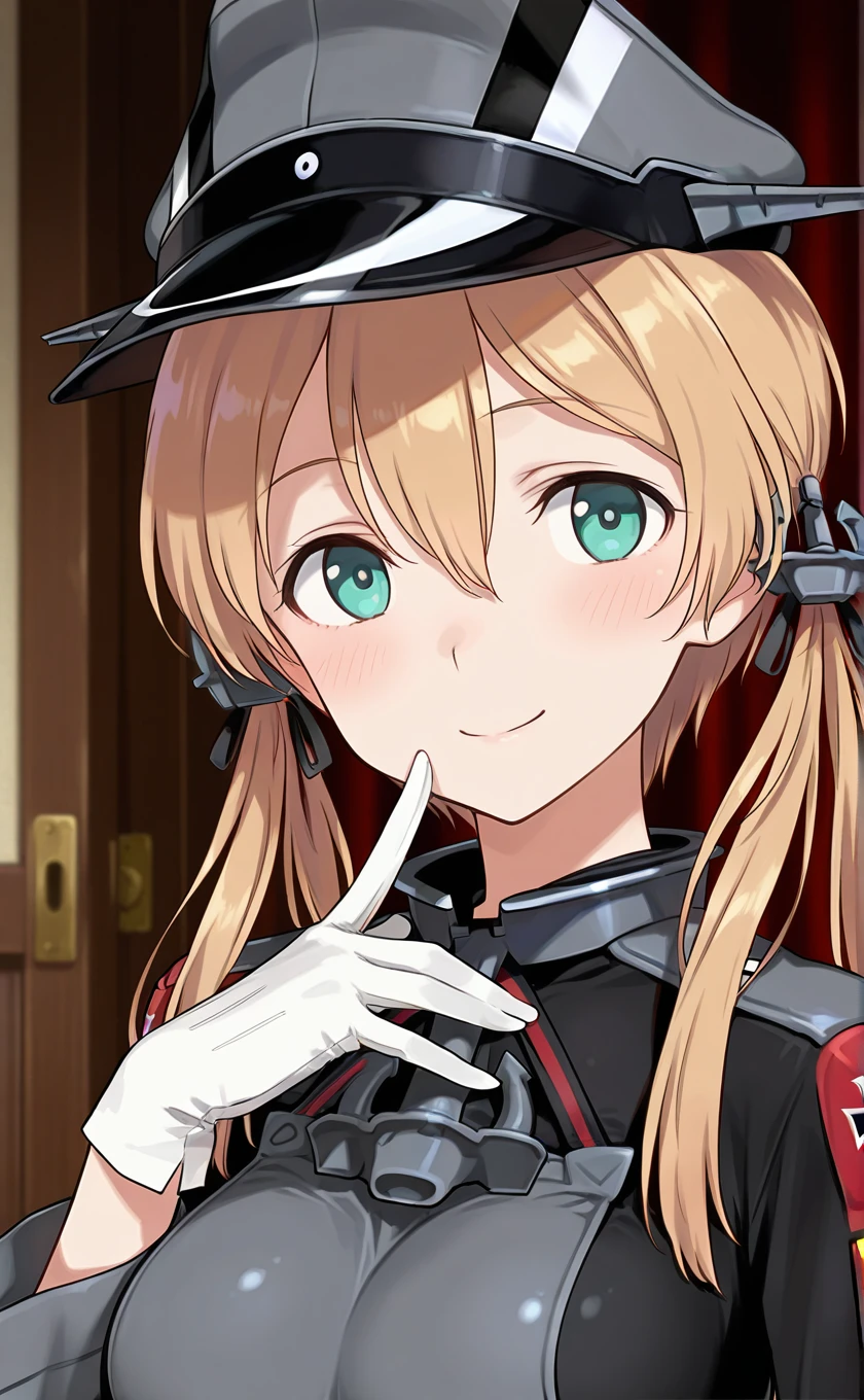 military hat,peaked cap,long hair,blonde hair,low twintails,anchor hair ornament,aqua eyes