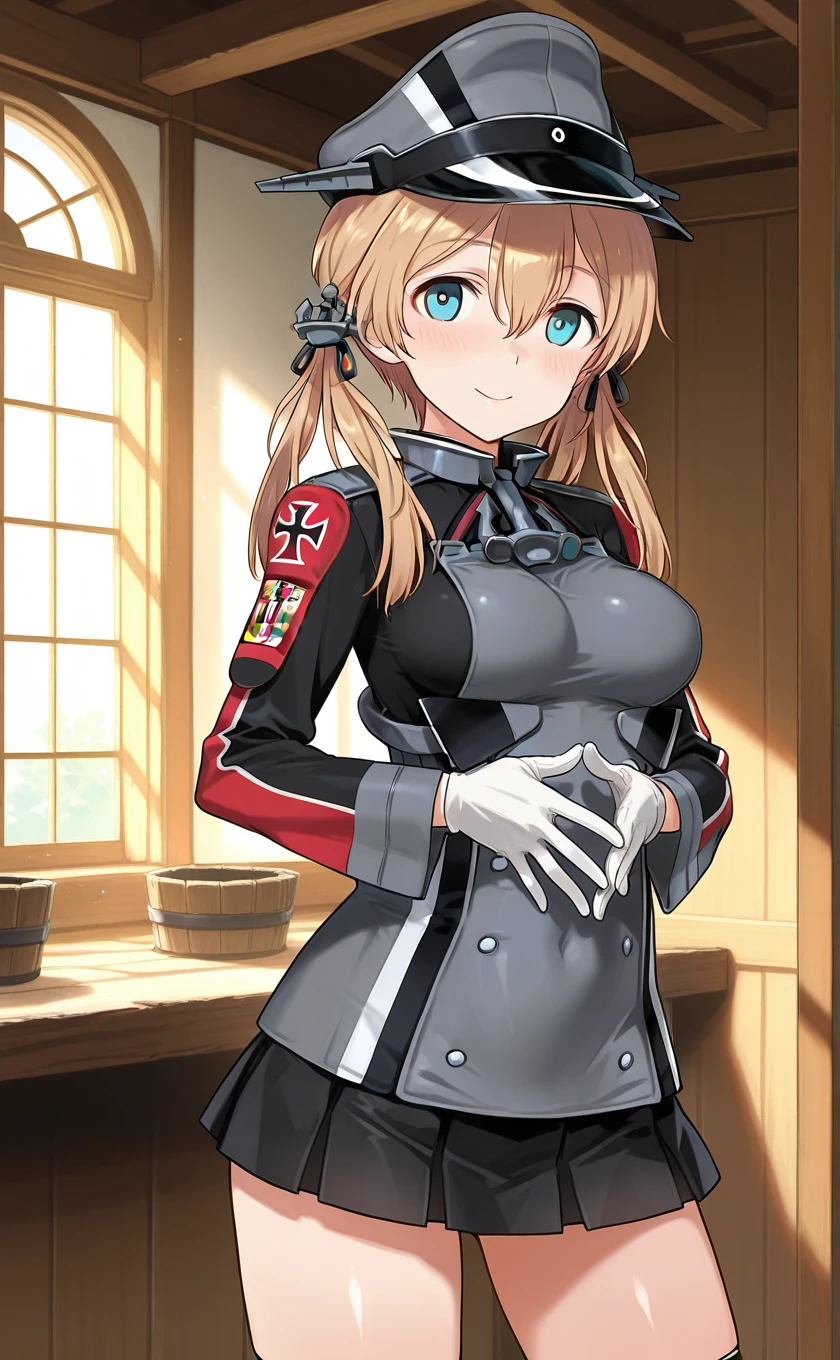 military uniform,iron cross,long sleeves,white gloves,black skirt,pleated skirt,over-kneehighs,black thighhighs,black footwear