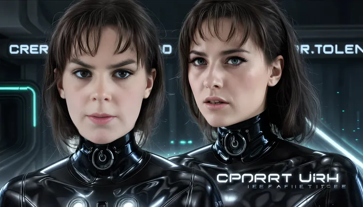 a woman wearing a very shiny latex catsuit. The catsuit is balanced, covering her entire body from neck to toe, with built-in gloves. The smooth, shiny texture of the latex reflects the light, creating highlights on the curves of the catsuit.
