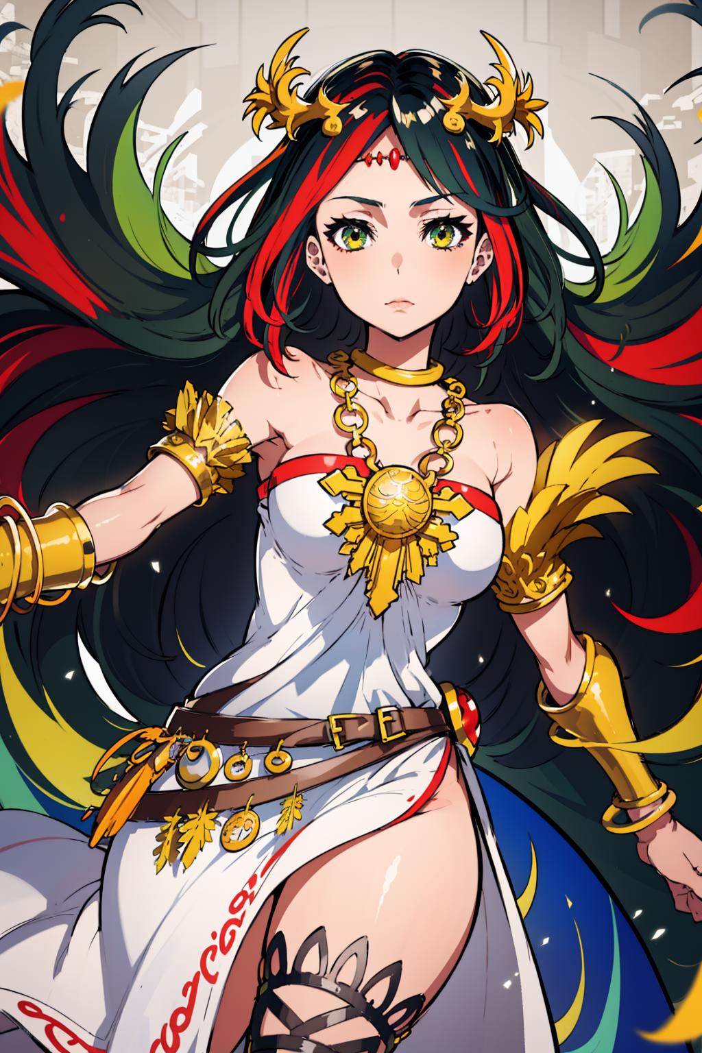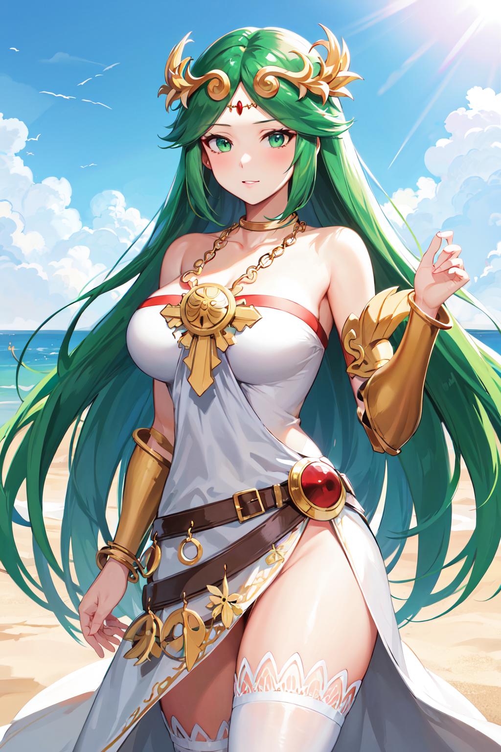 hmpa1, palutena, parted bangs, tiara, ?????????????, necklace, ???? shoulders, strapless dress, vambraces, belt, white dress, white thighhighs, single thighhigh