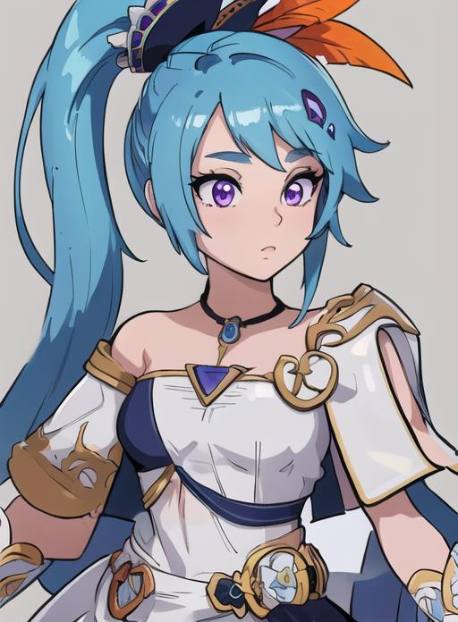 ponytail, blue hair, purple eyes, hair ornament,