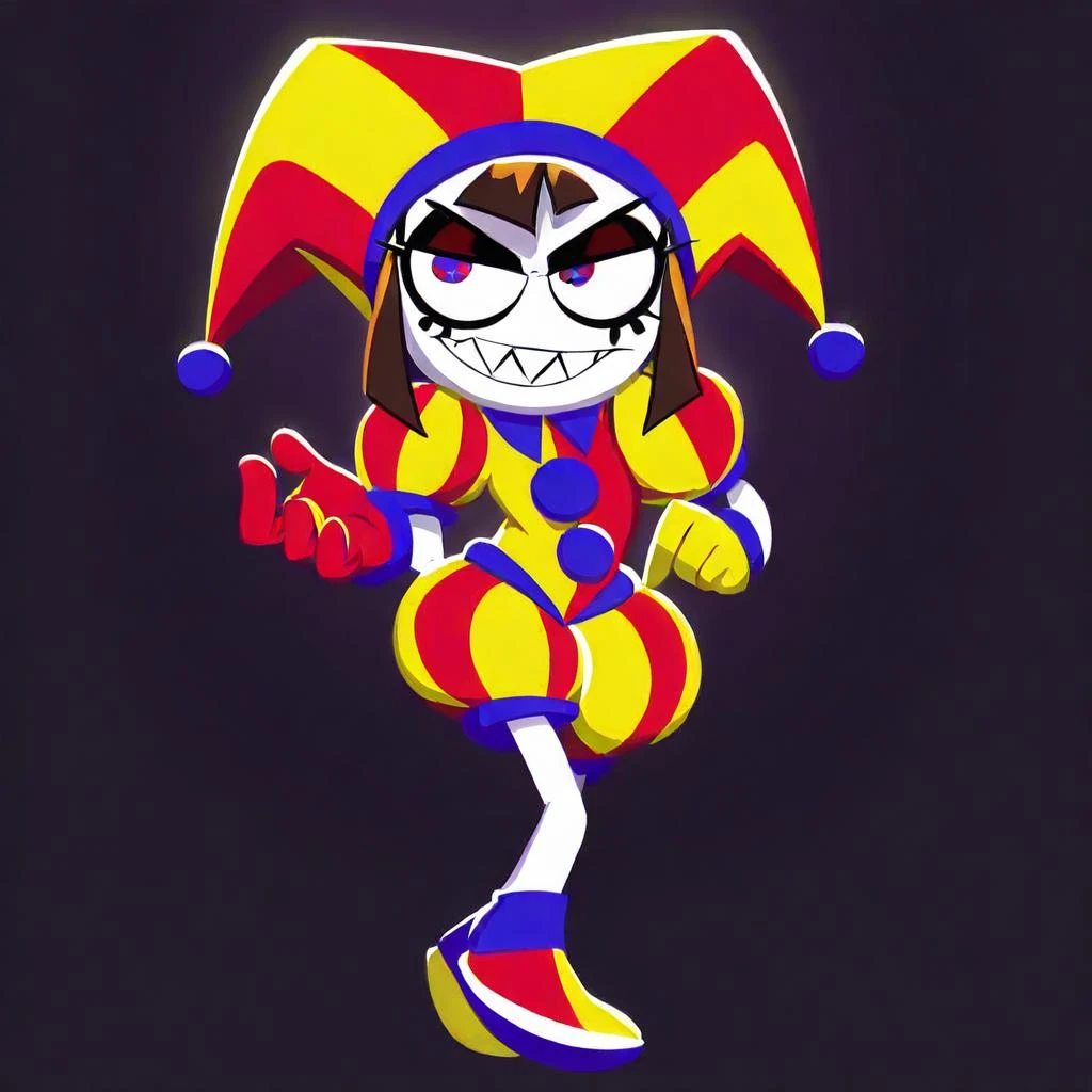 brown hair, white skin, red and blue eyes, symbol-shaped pupils, jester cap
