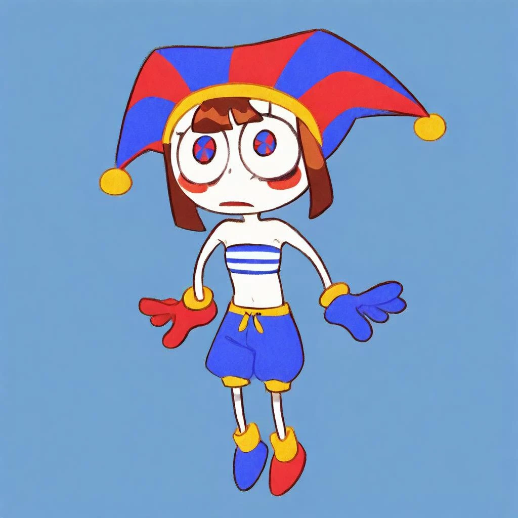 blue-red jester outfit, puffy sleeves, blue and red gloves, blue-red mismatched shoes