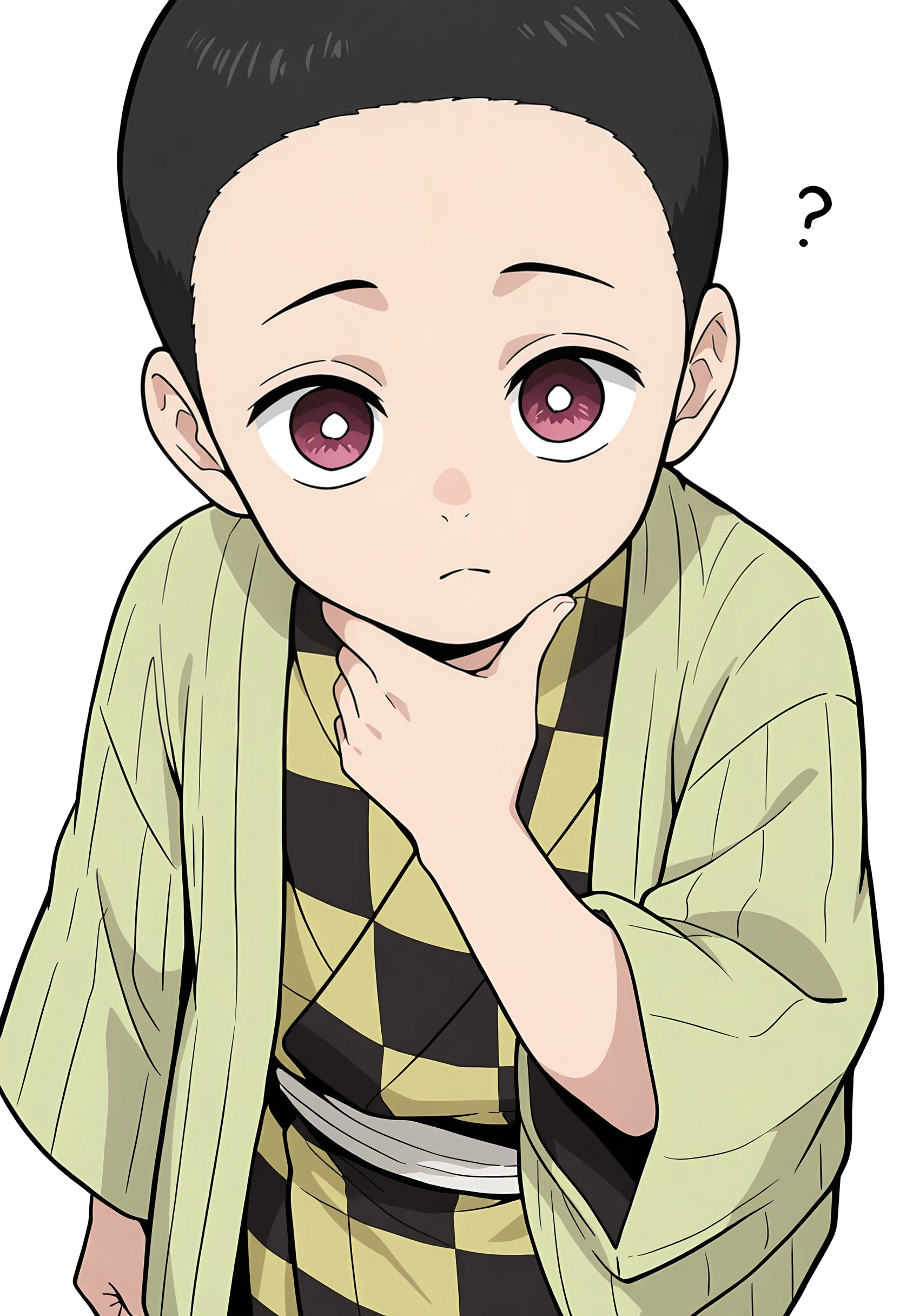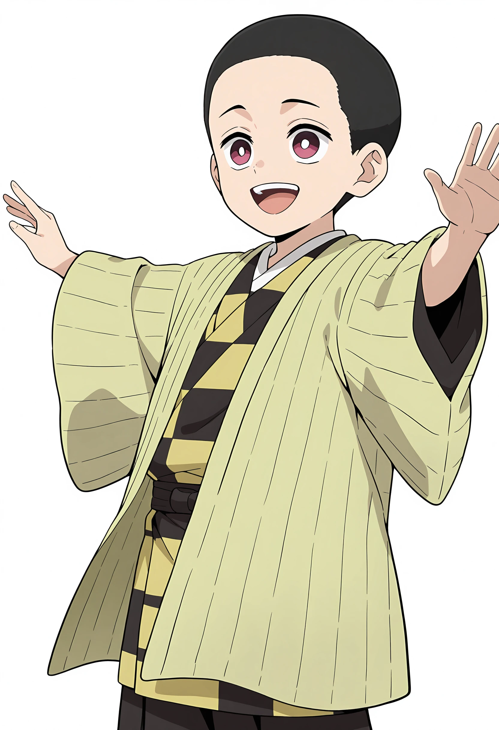 1boy, Kamado Shigeru, child, male focus, solo, shaved hair, black hair, pink eyes, white pupils,