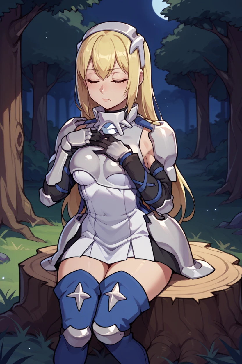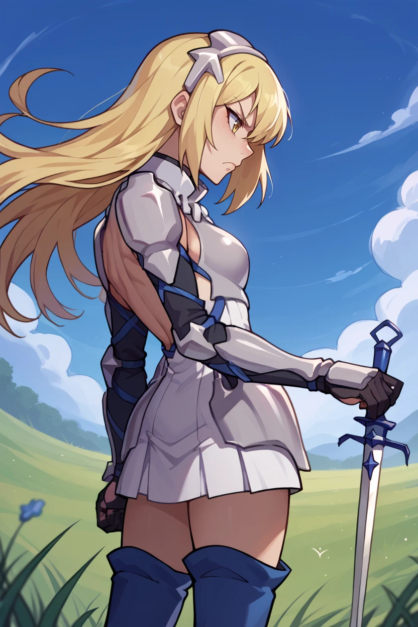 Add "hairband, armored dress, gauntlets, black gloves, thigh boots" for her armored dress.