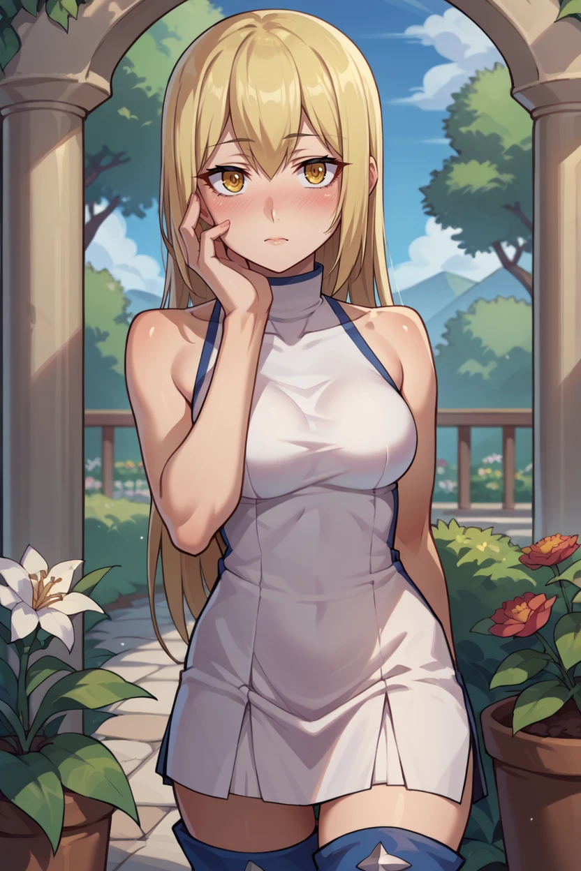 Add "white turtleneck, white dress, sleeveless, short dress, thigh boots" for her casual dress.