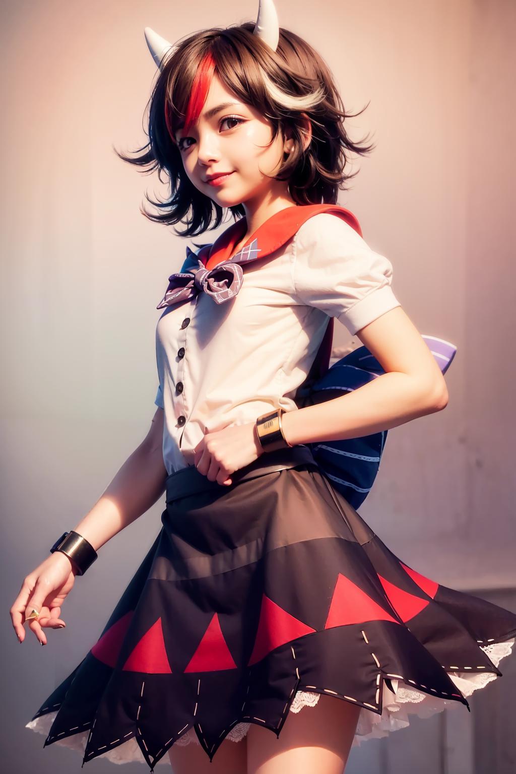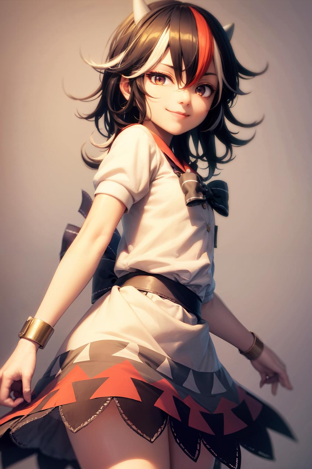 tag:kijin seija, 1girl,horns,short hair,multicolored hair,red eyes,bow,short sleeves, bracelet, dress,