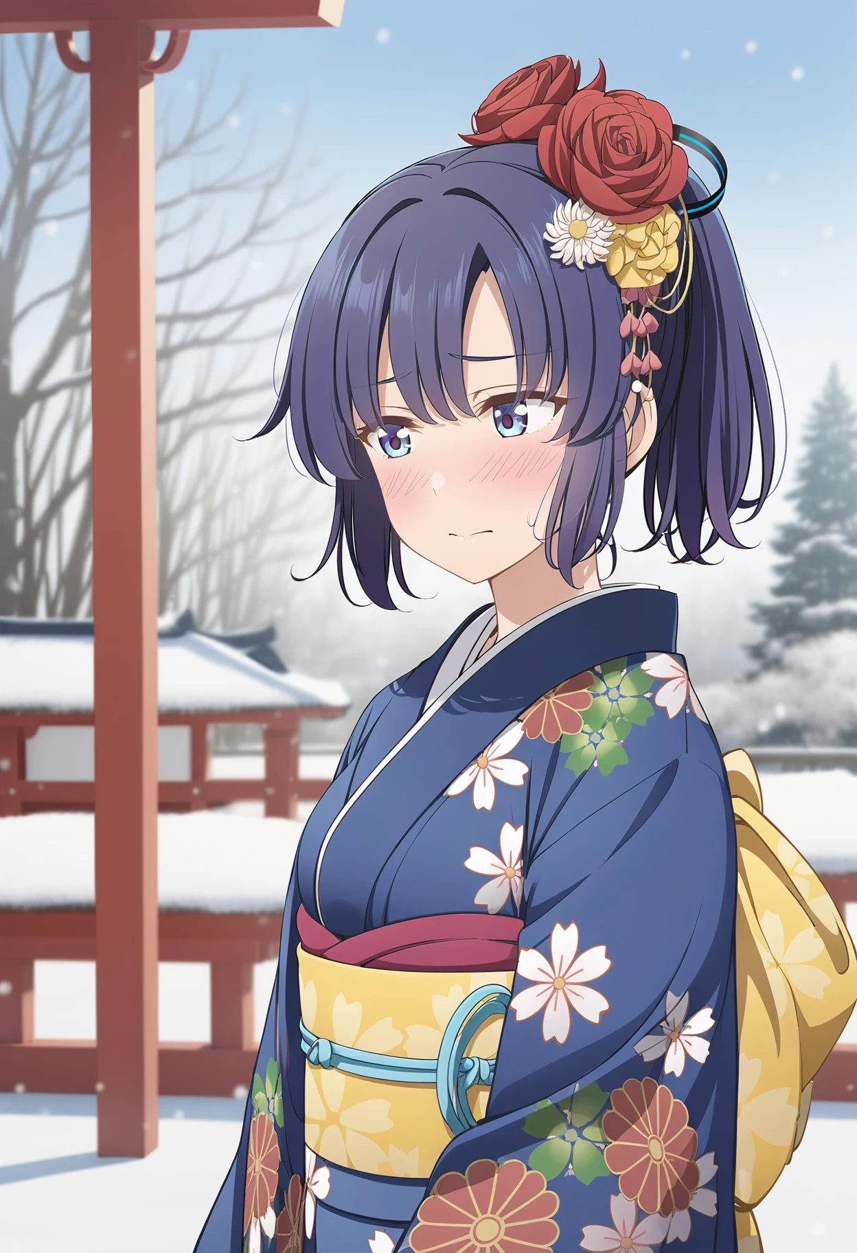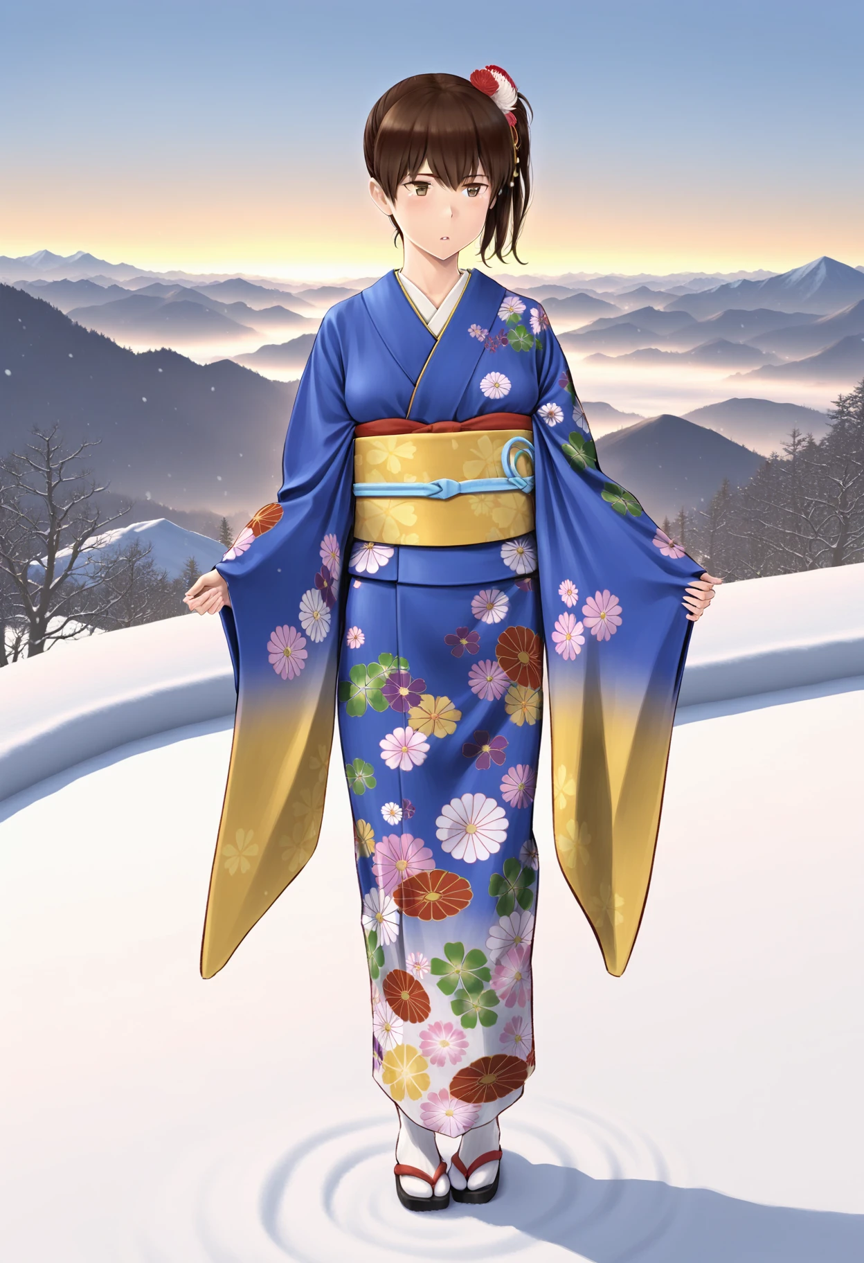 1girl, kaga \(kancolle\), kantai collection, brown eyes, brown hair, side ponytail, blue kimono, print kimono, floral print, hair flower, hair ornament, obi, yellow bow, furisode, wide sleeves, long sleeves,