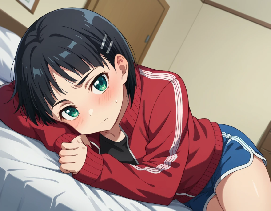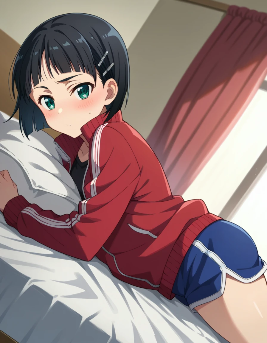 suguha kirigaya, short hair, black hair, hair ornament, hairclip, green eyes,