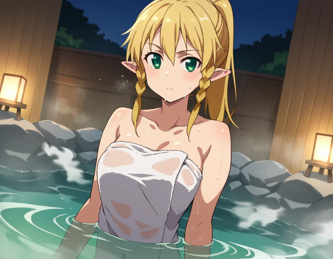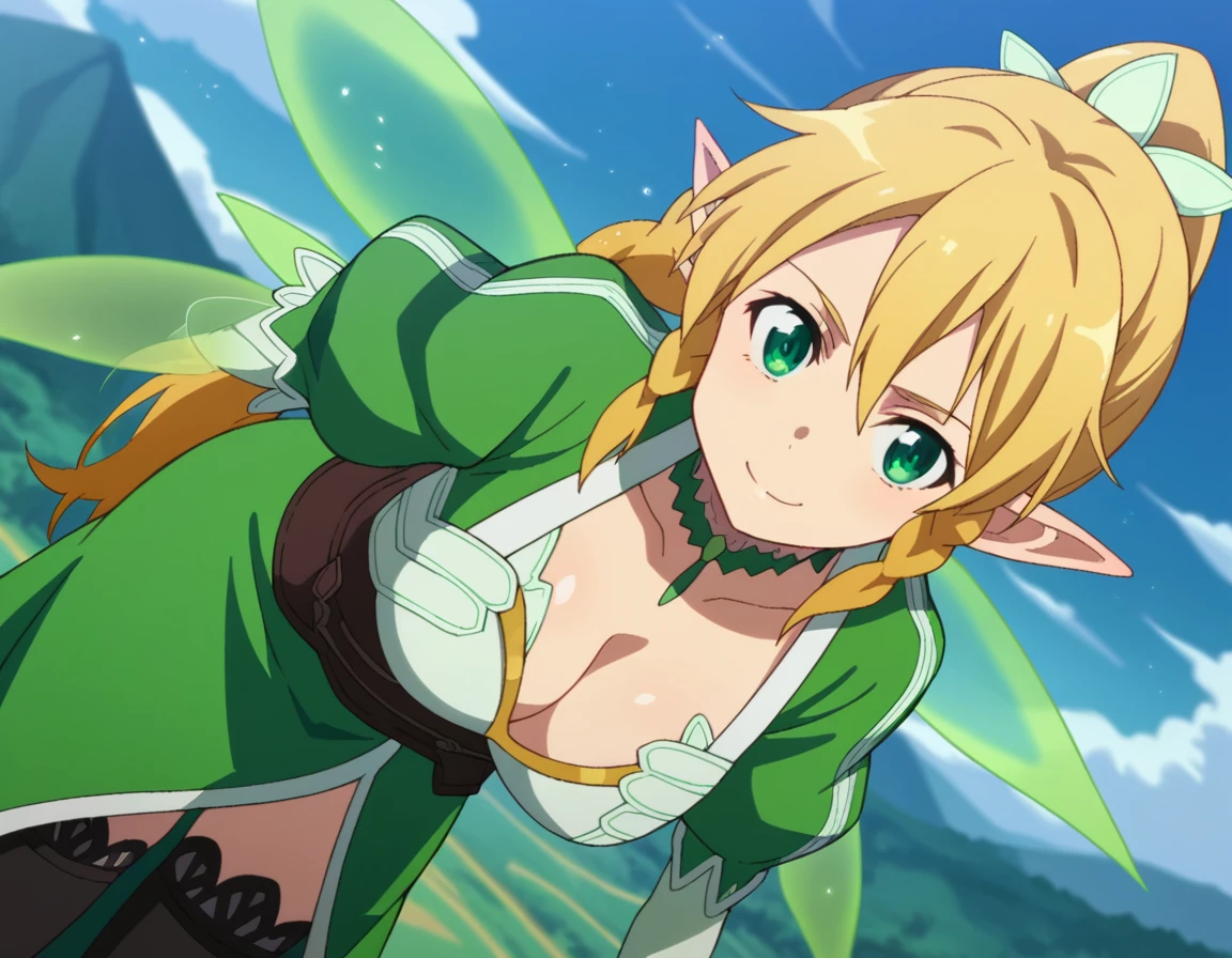 suguha kirigaya, long hair, blonde hair, hair between eyes, green eyes, ponytail, braid, pointy ears, twin braids,