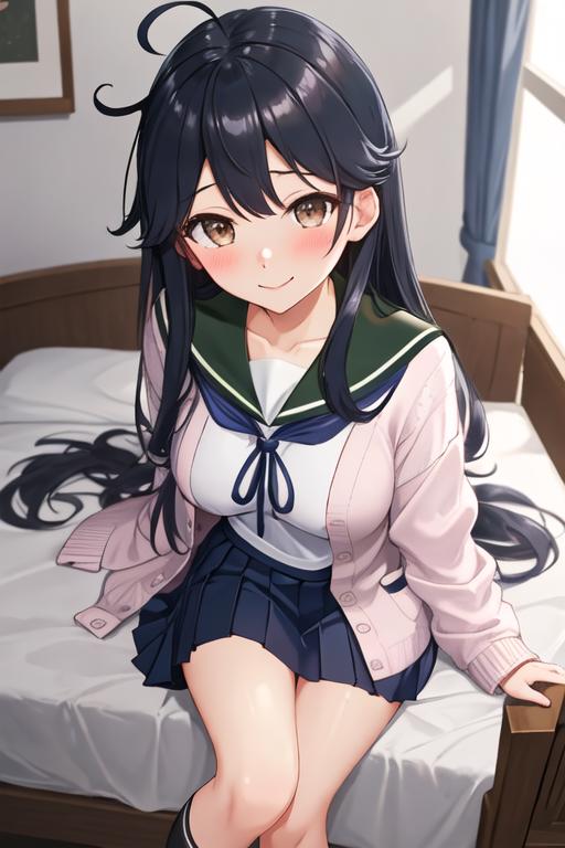 The trigger word is ushio_kantaicollection, and the recommended tags are best quality, masterpiece, highres, solo, {ushio_kantaicollection:1.15}, long_hair, black_hair, ahoge, brown_eyes, blush, ???????, serafuku, large_???????.