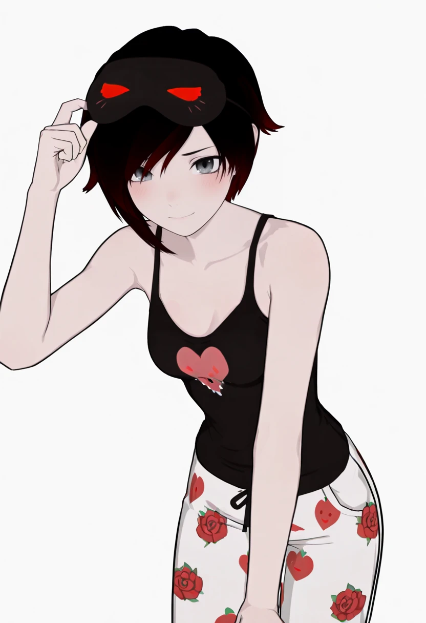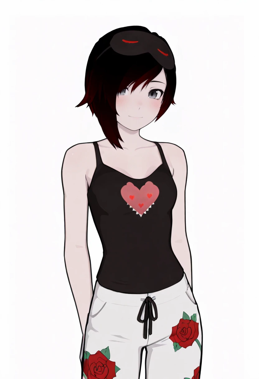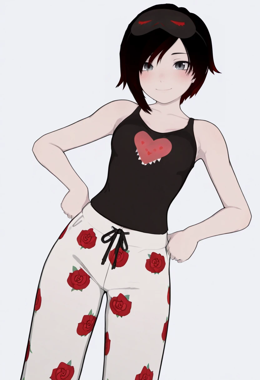 black sleep mask on head, pajamas, black tank top with heart print, bare shoulders, rose print pants, white pants