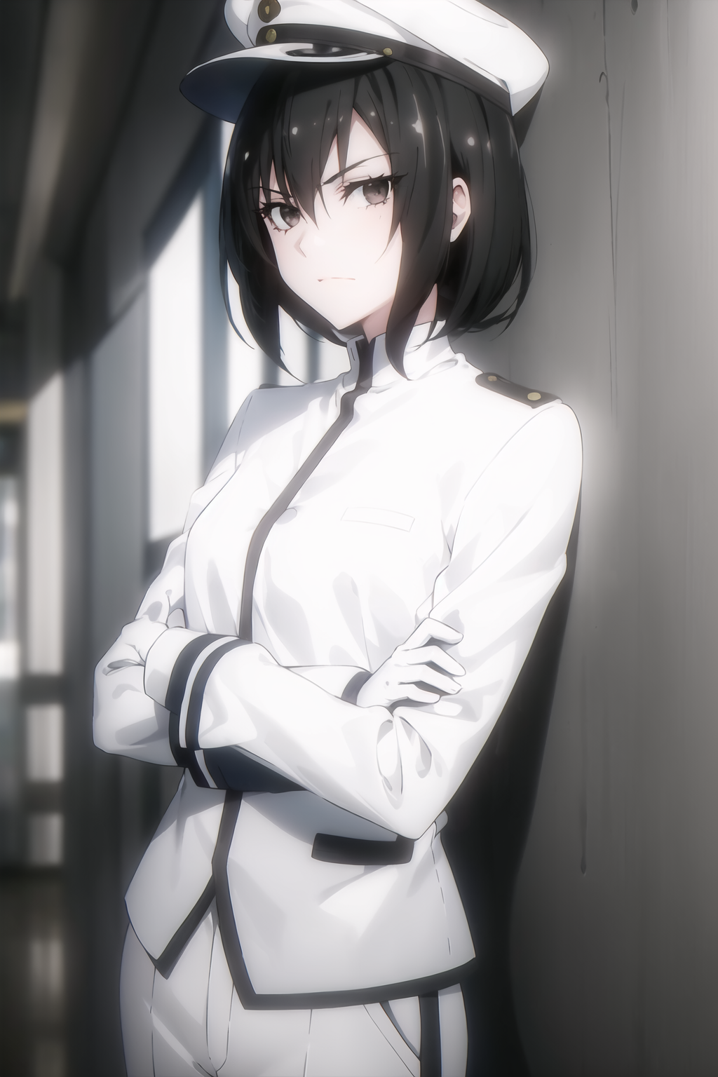 AmouMilitary, white_uniform, white_pants, hat, black hair, short hair, military uniform, white gloves,