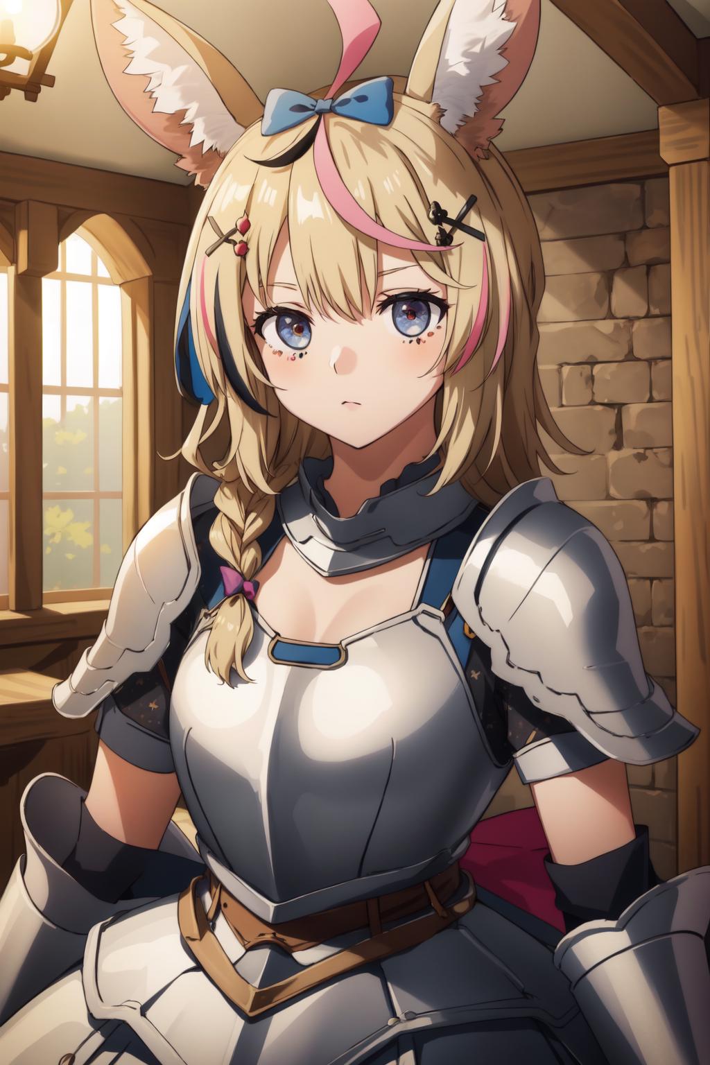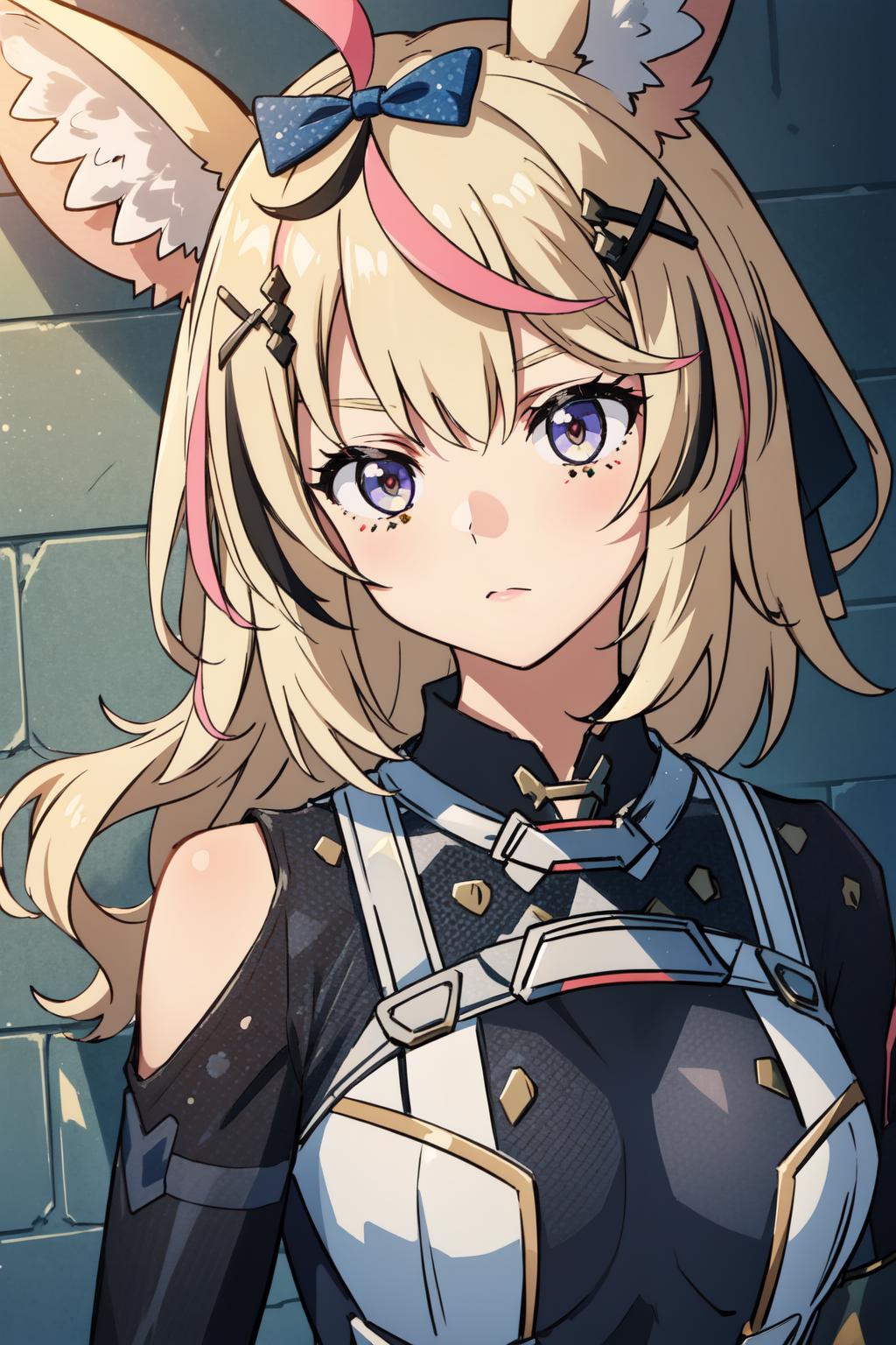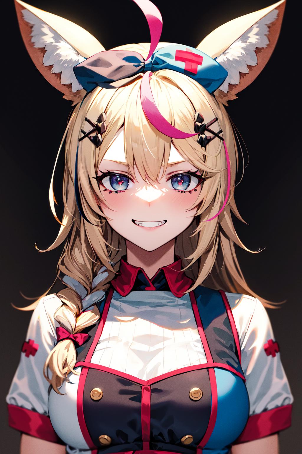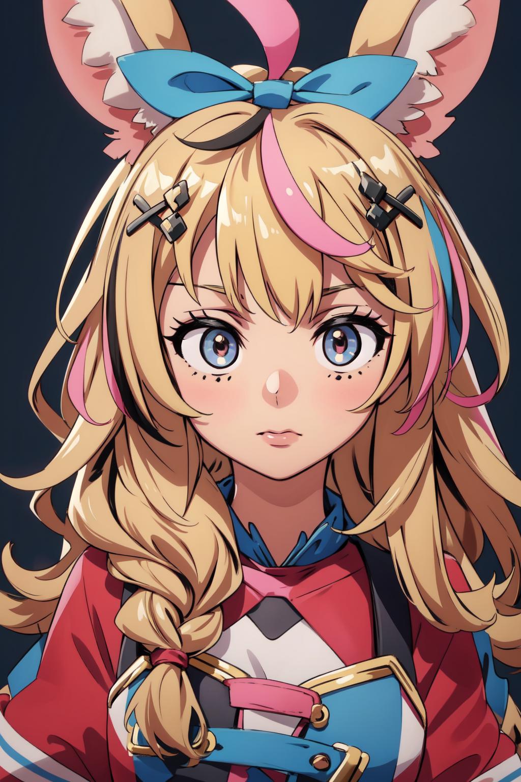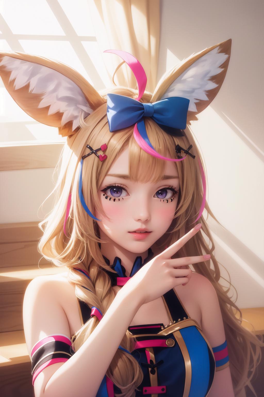 outfit1op1, animal ears, hairclip, streaked hair, hair bow, jester cap, fox tail, thighhighs, navel cutout, mismatched legwear, elbow gloves, single glove, ???? shoulders, vertical stripes, skirt