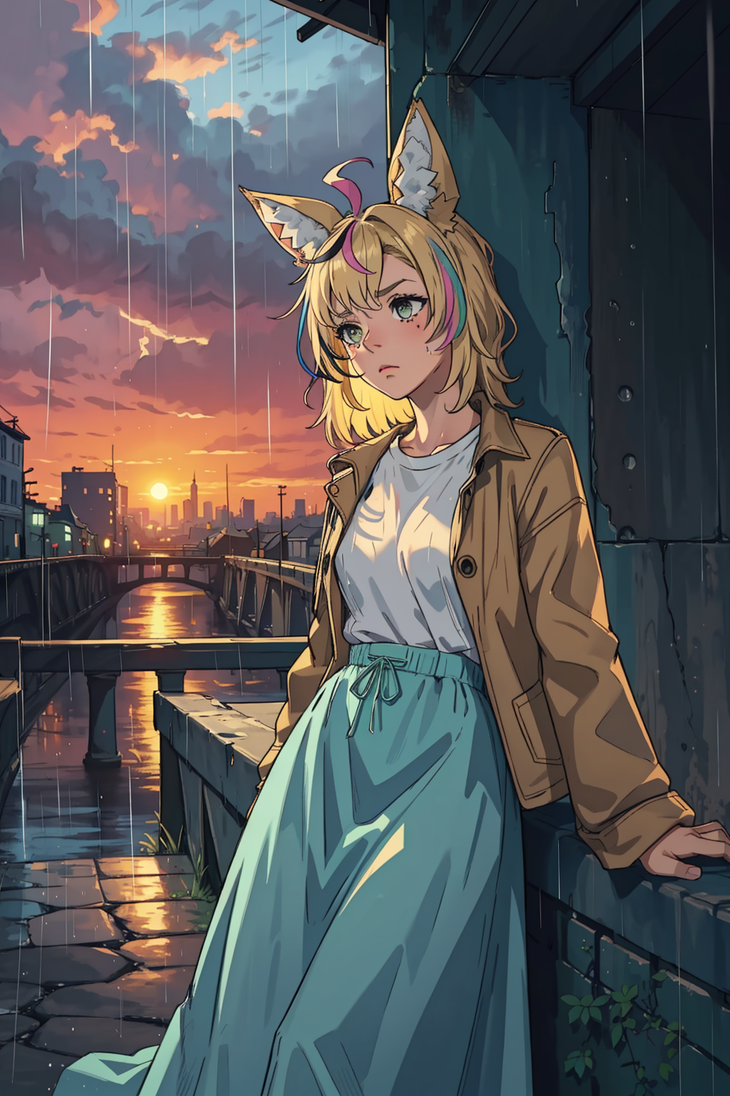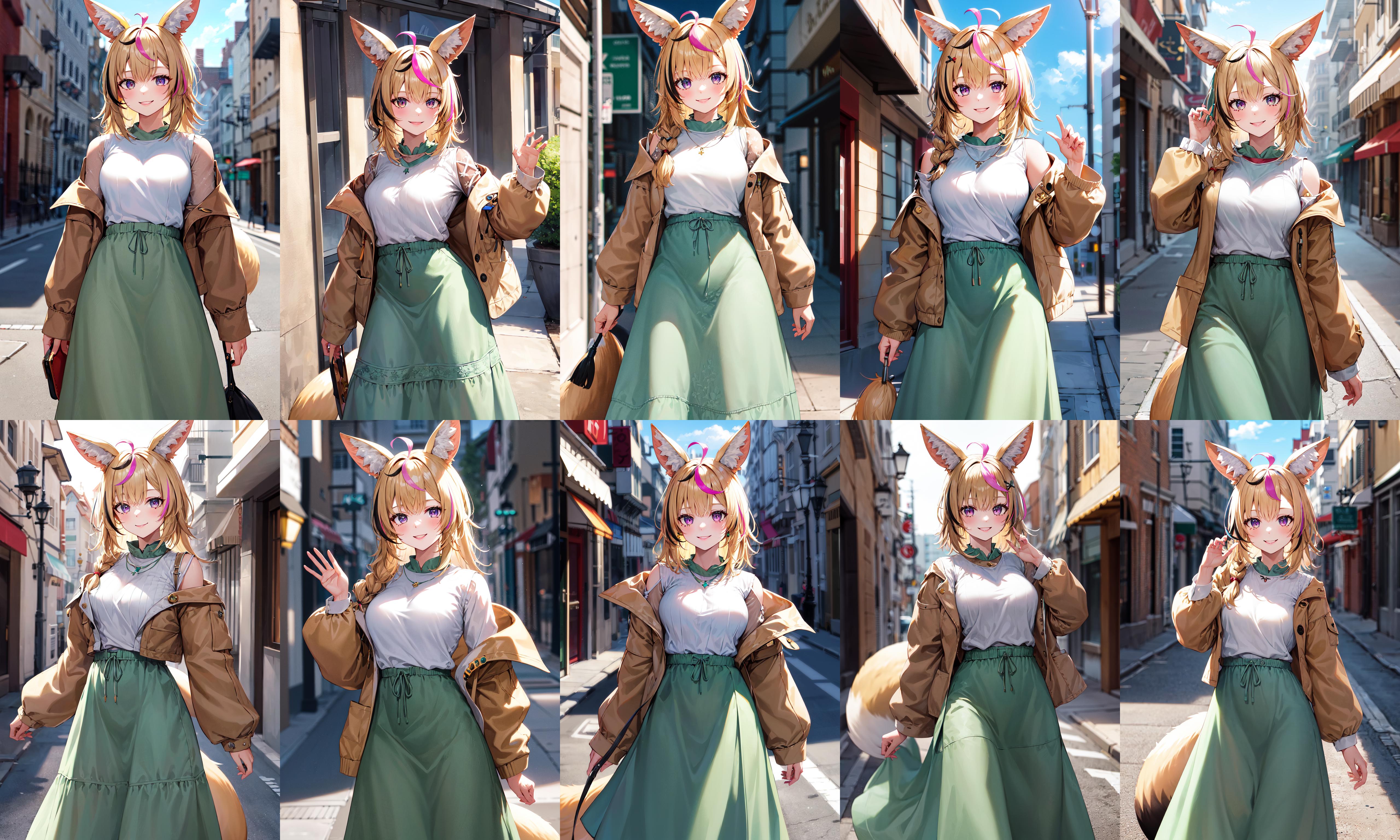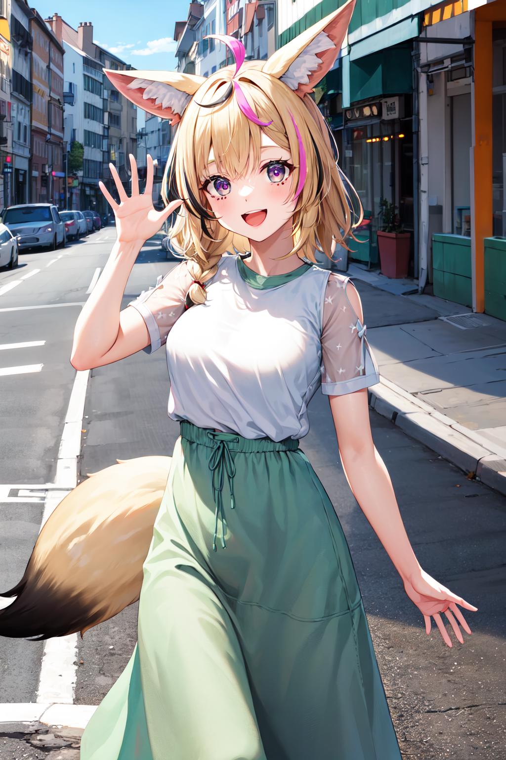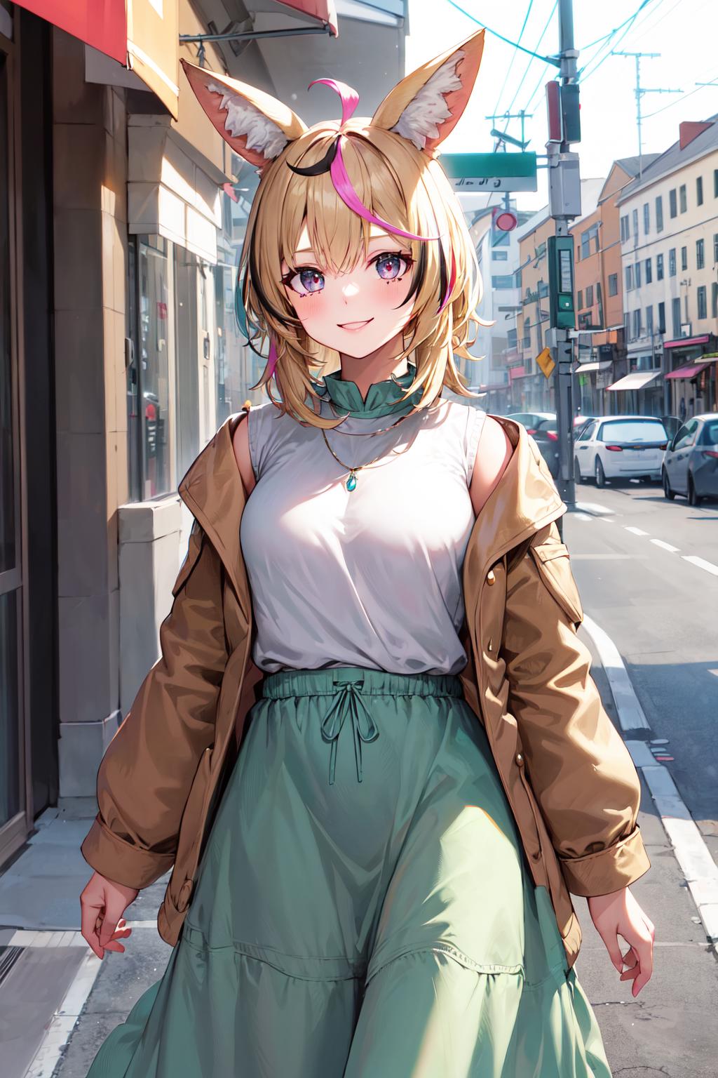 outfit3op1, animal ears, fox tail, streaked hair, brown jacket, white shirt, long sleeves, long skirt, jewelry, green skirt