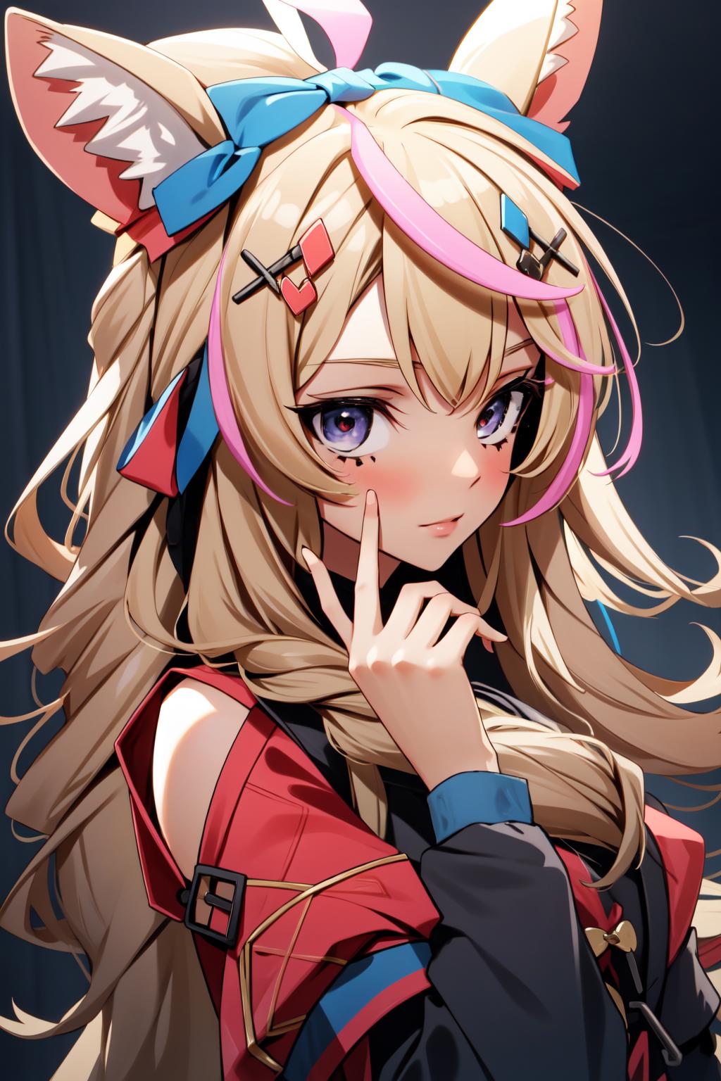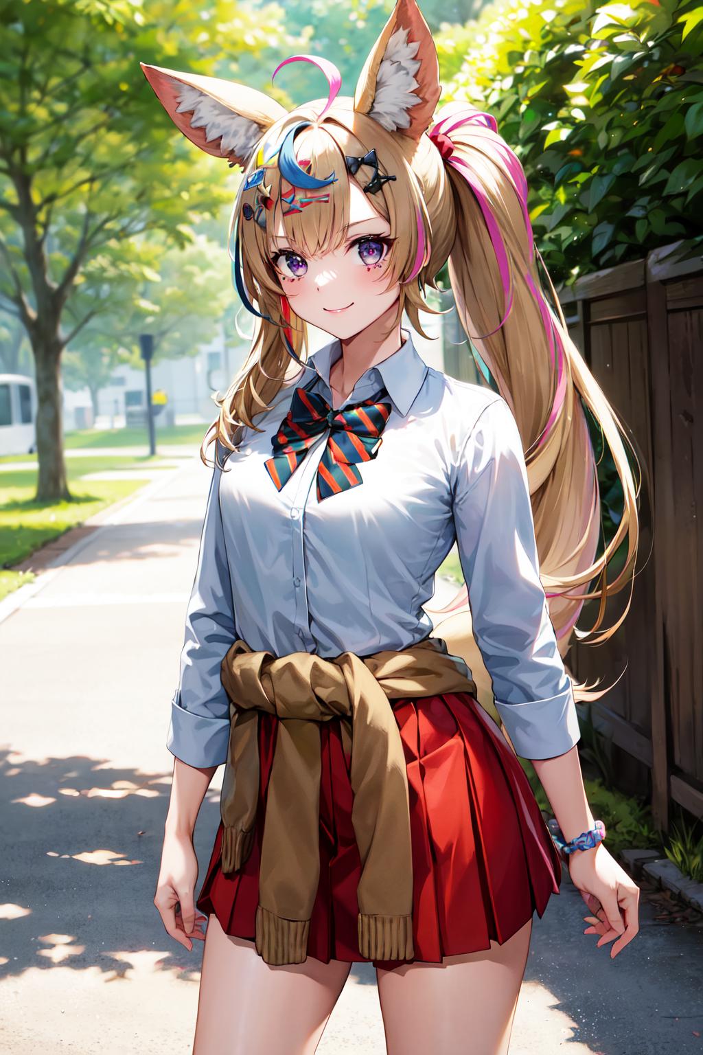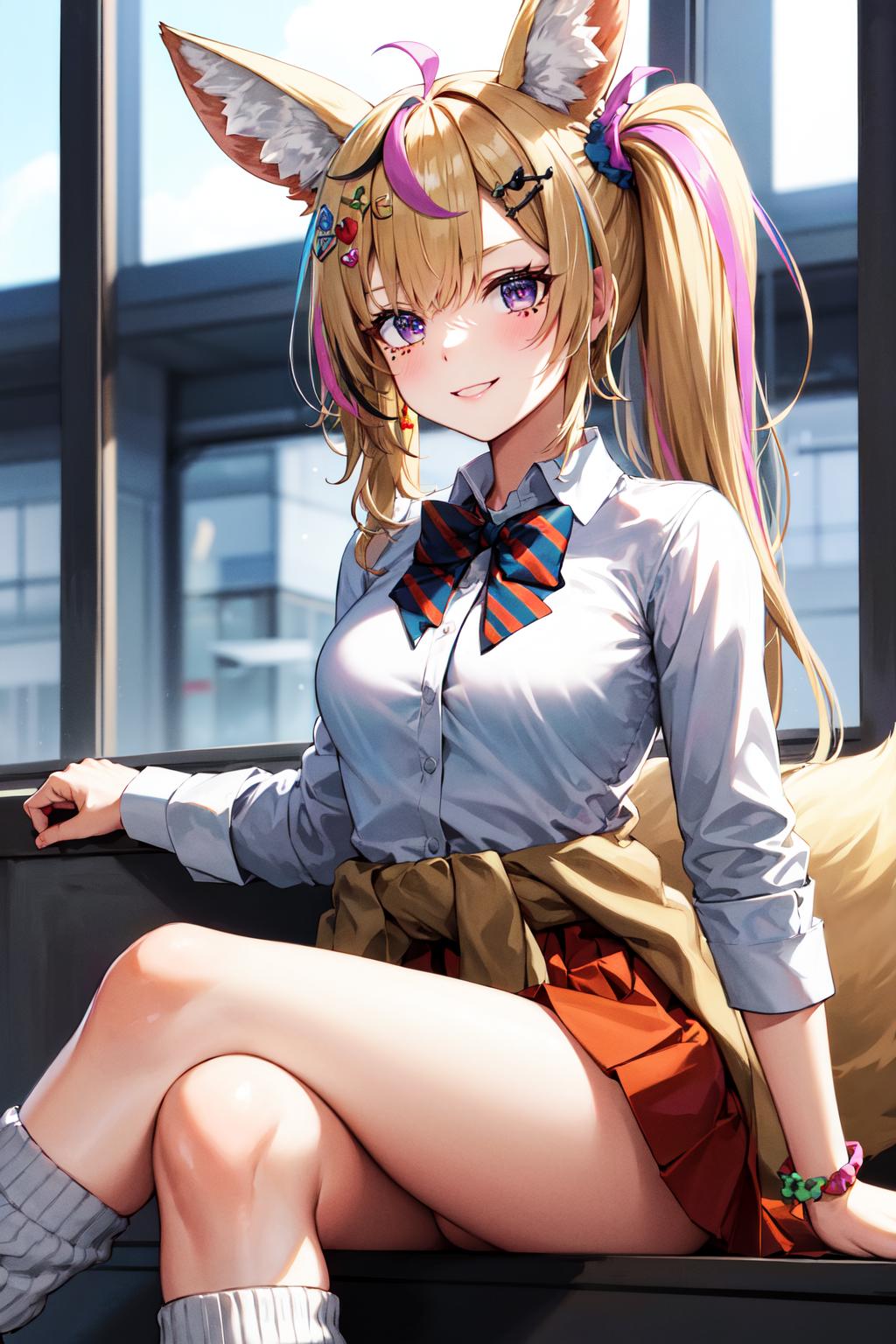 outfit4op1, animal ears, hair ornament, side ponytail, fox tail, clothes around waist, animal ears, loose socks, streaked hair, white shirt, school uniform, wrist scrunchie, white socks, gyaru, miniskirt, pleated skirt, red skirt, loose bowtie, long sleeves, jewelry