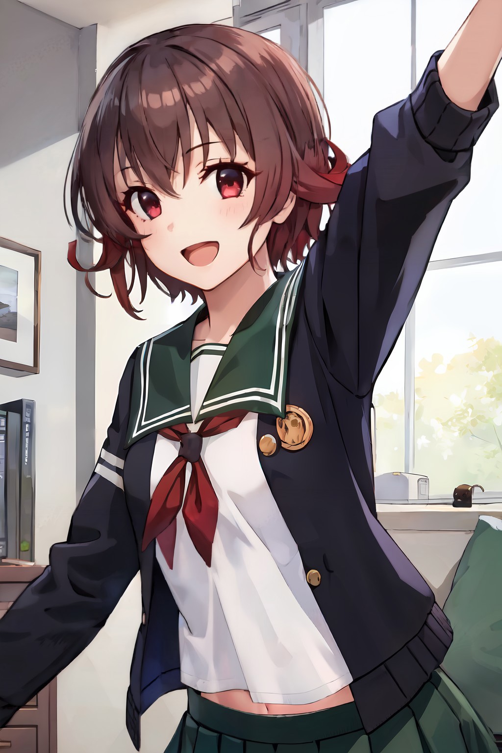 MutuskiKaiNiKC, (KaiNi) outfit, (white) serafuku, (green) sailor collar, (red) neckerchief, (black) jacket, (green) pleated skirt, (black) pantyhose, shoes