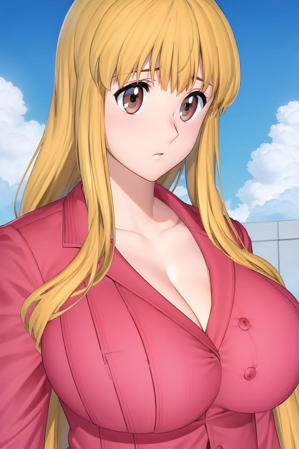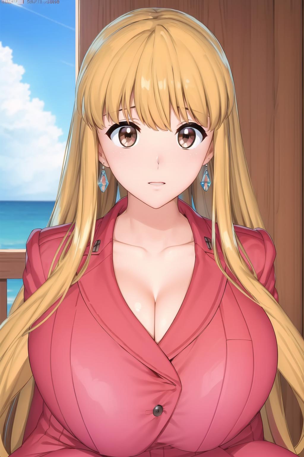 Pink_jacket,Pink_Long_pants,Deep cleavage,