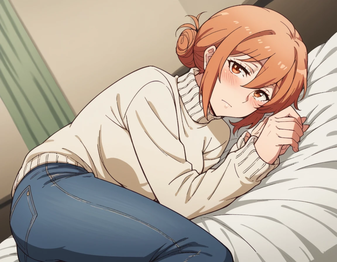 yuigahamama, hair bun, mature female, orange eyes, orange hair, short hair, single hair bun, hair between eyes, sidelocks,