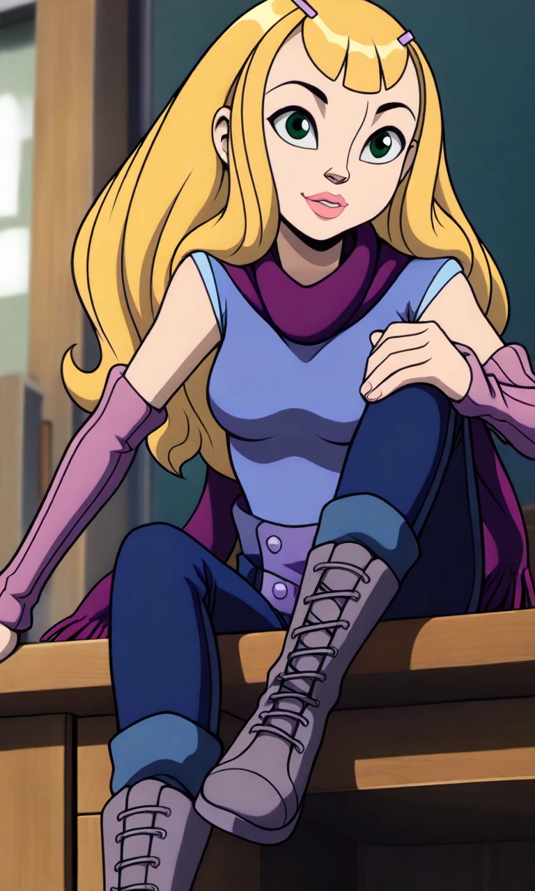 Appearance: 1girl, solo, allie underhill, blonde hair, long hair, green eyes, lips, hair clips