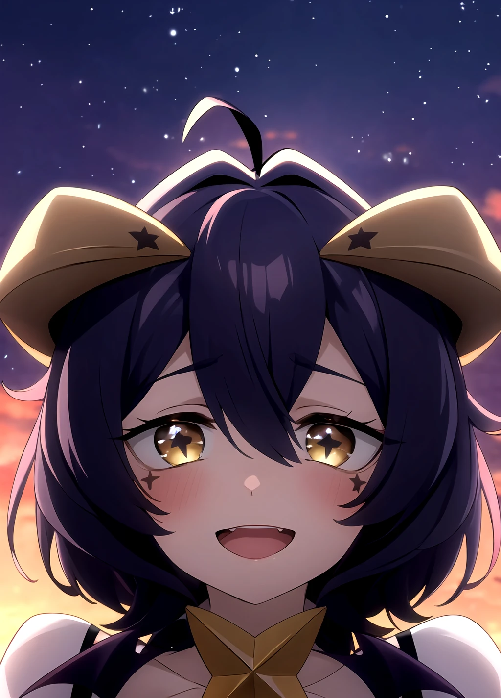 Trigger words: Utena Hiiragi, 1girl, horns, purple hair, short hair, star (symbol), yellow eyes, hair between eyes, antenna hair, bangs, symbol-shaped pupils, star-shaped pupils , costume, small ???????, star pasties, wings, pasties, navel, corset, demon wings, bat wings, lowleg pants, elbow gloves