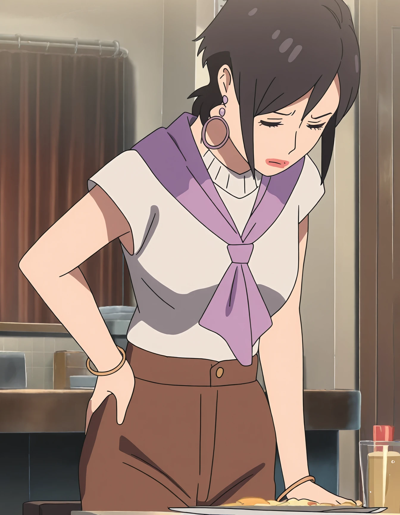 tamaki, hoop earrings, brown pants, purple neckerchief, short sleeves