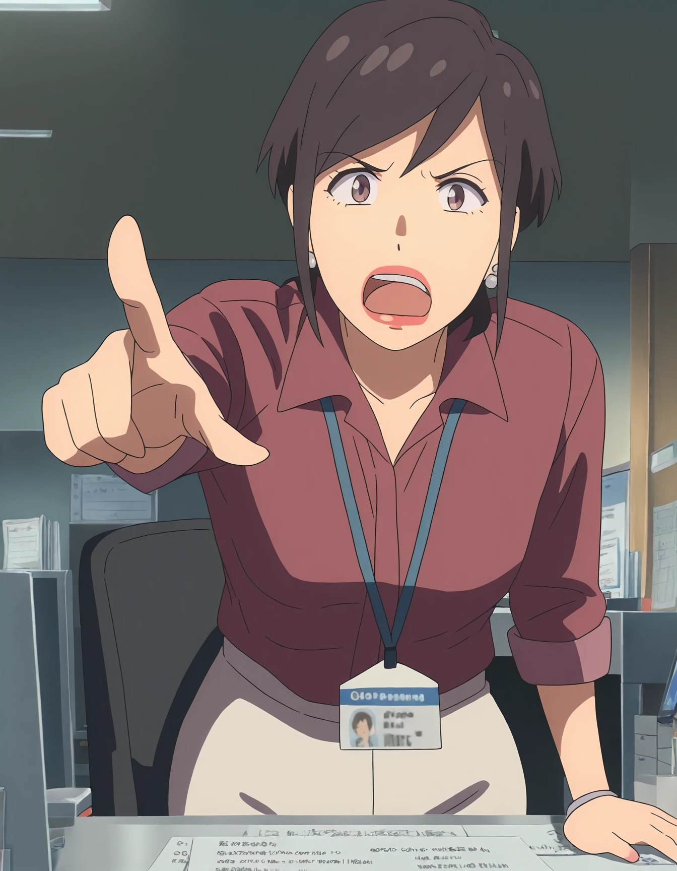 tamaki, office lady, lanyard, collared shirt, pink shirt, earrings