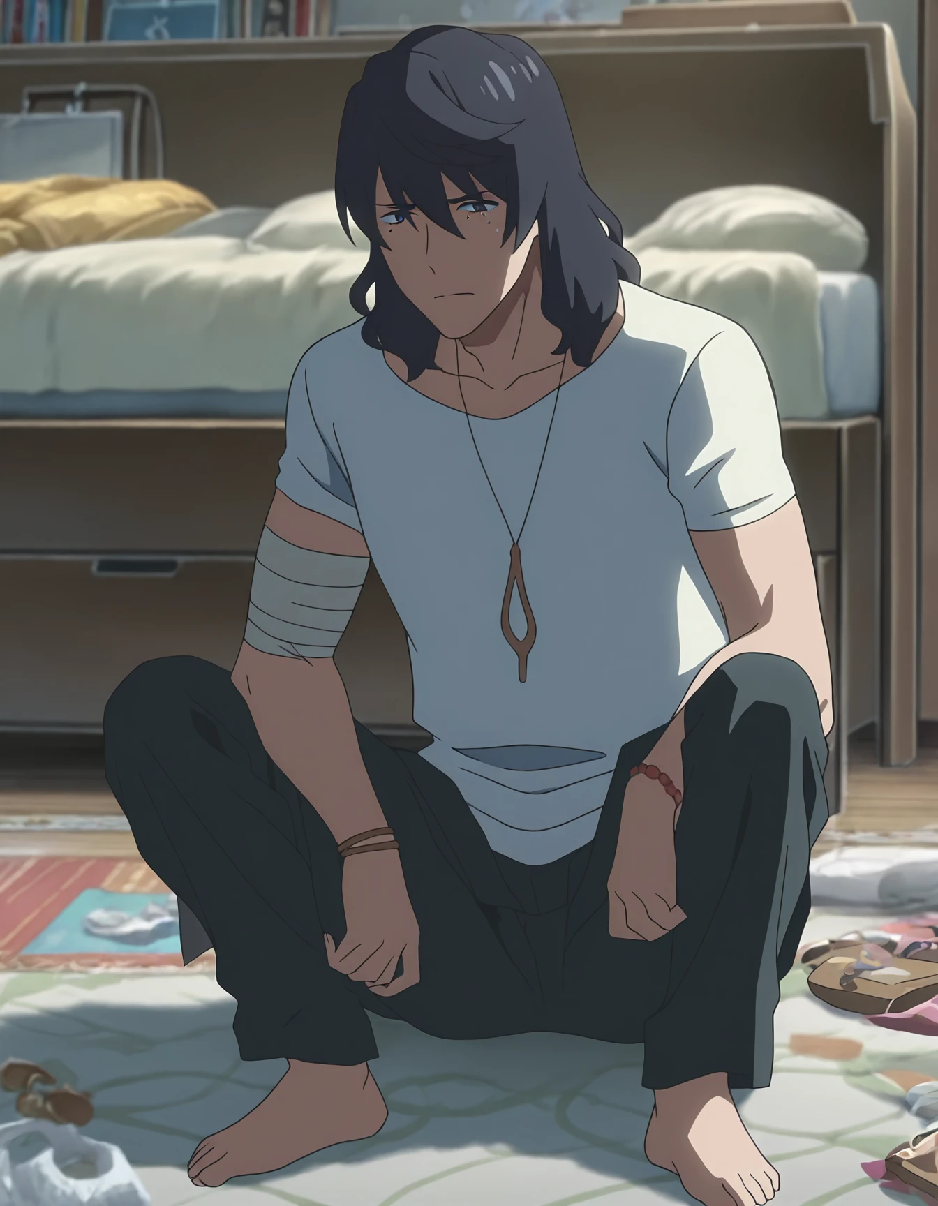 souta, long hair, white shirt, black pants, necklace, t-shirt, bracelet, short sleeves