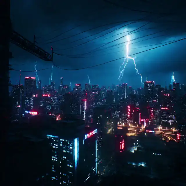 Example 2: E13c7r1c electricity effect courses through the wires of a massive futuristic city, making the neon signs flicker erratically. A single bolt jumps from a rooftop antenna, striking a nearby drone, which momentarily glitches before stabilizing and resuming its patrol through the electric storm.