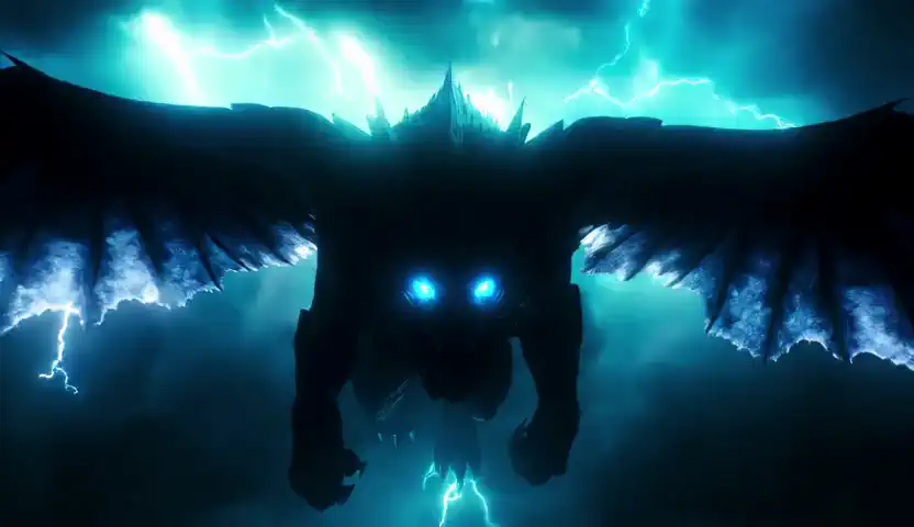 Example 1: E13c7r1c electricity effect streaks through a swirling storm cloud, revealing the shadowy outline of a massive, winged beast. Each lightning strike illuminates its glowing blue eyes, and for a brief moment, its metal-plated wings shimmer before vanishing back into the storm.