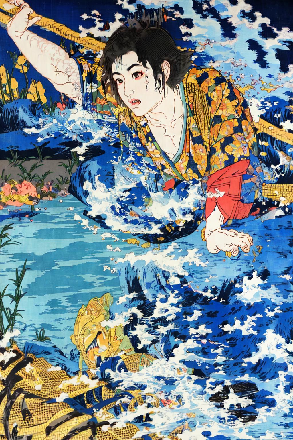 使用了歌川国芳,(日本江户时代人,浮世绘歌川派晚期大师之一)。的图集训练了一期类似浮世绘风格的lora。建议使用国风3跑图。