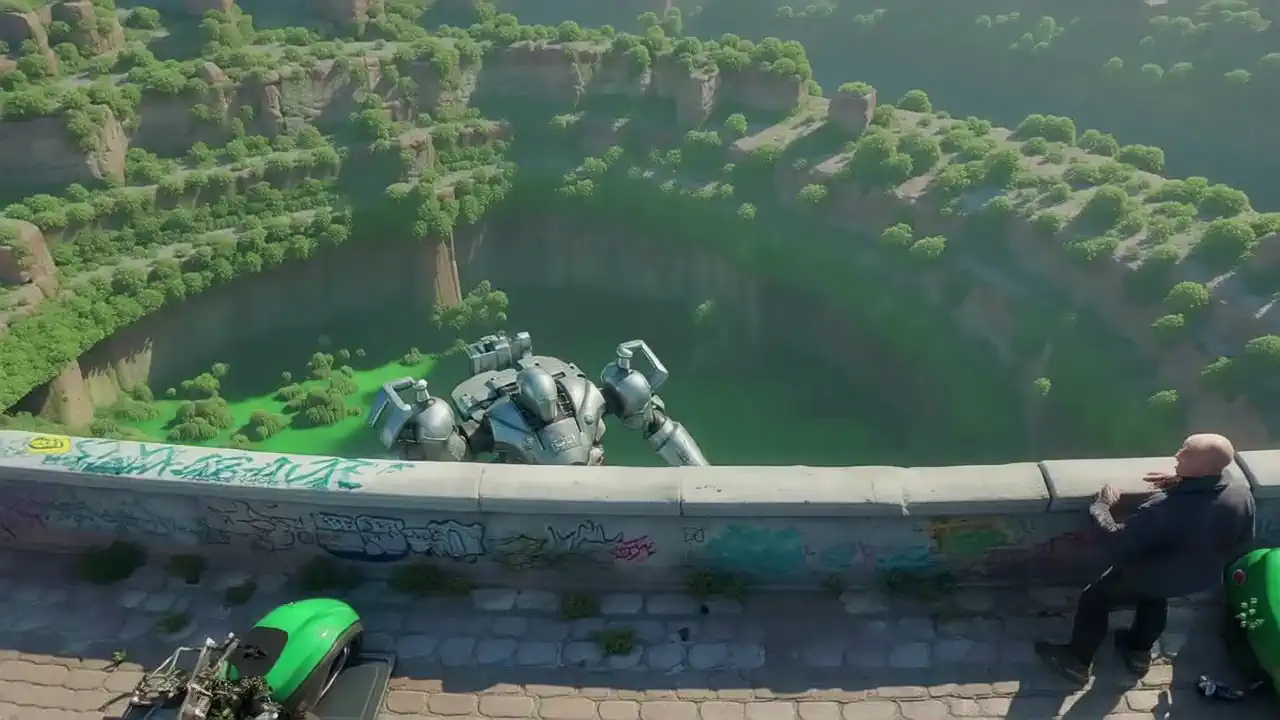 This LoRA enables the creation of cinematic sequences featuring characters and imaginative scenery centered around a large chasm in the center of the frame. The typical view will be from a heightened viewpoint looking down with subtle camera panning in horizontal aspect ratio generation. Can still create fun results at other aspect ratios/resolutions.