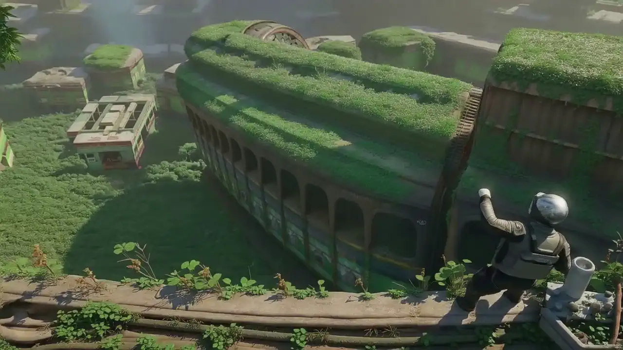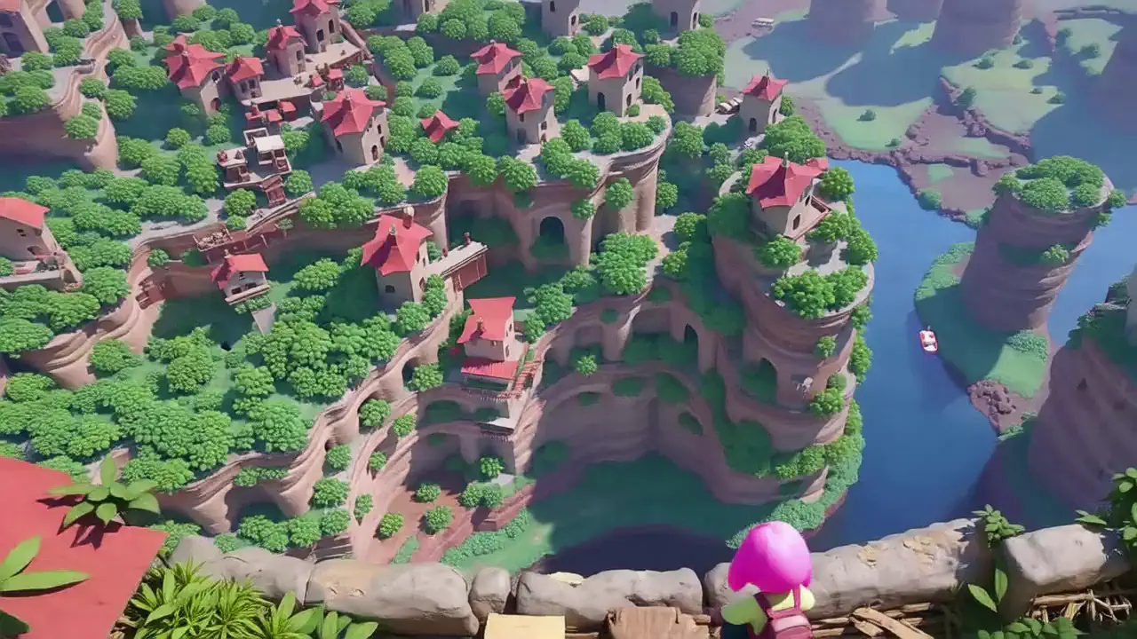 kxsr, A vibrant, stylized jungle scene unfolds, showcasing a partially ruined, whimsical city perched atop a cliff overlooking a deep chasm filled with rushing water. A lone female character with pink hair and a backpack sits on the cliffs edge, gazing down at the scene below. The city displays a mix of dilapidated structures and lush vegetation. Small boats navigate the chasm.
