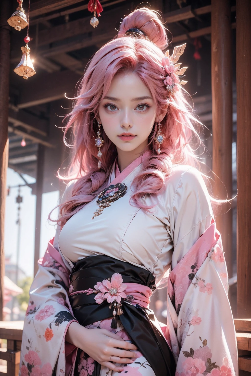 shenzi,1girl,long hair,pink hair,purple eyes,very long hair,hair_ornament,pink kimono