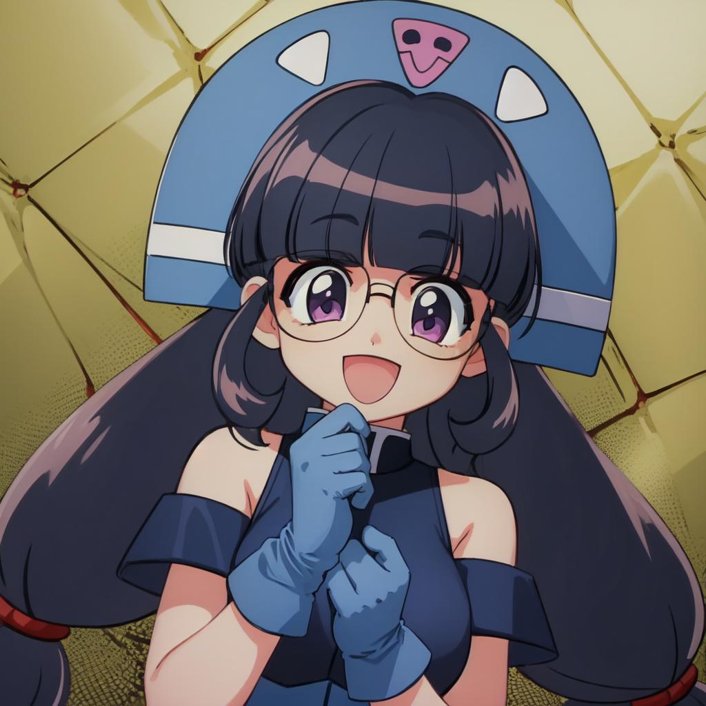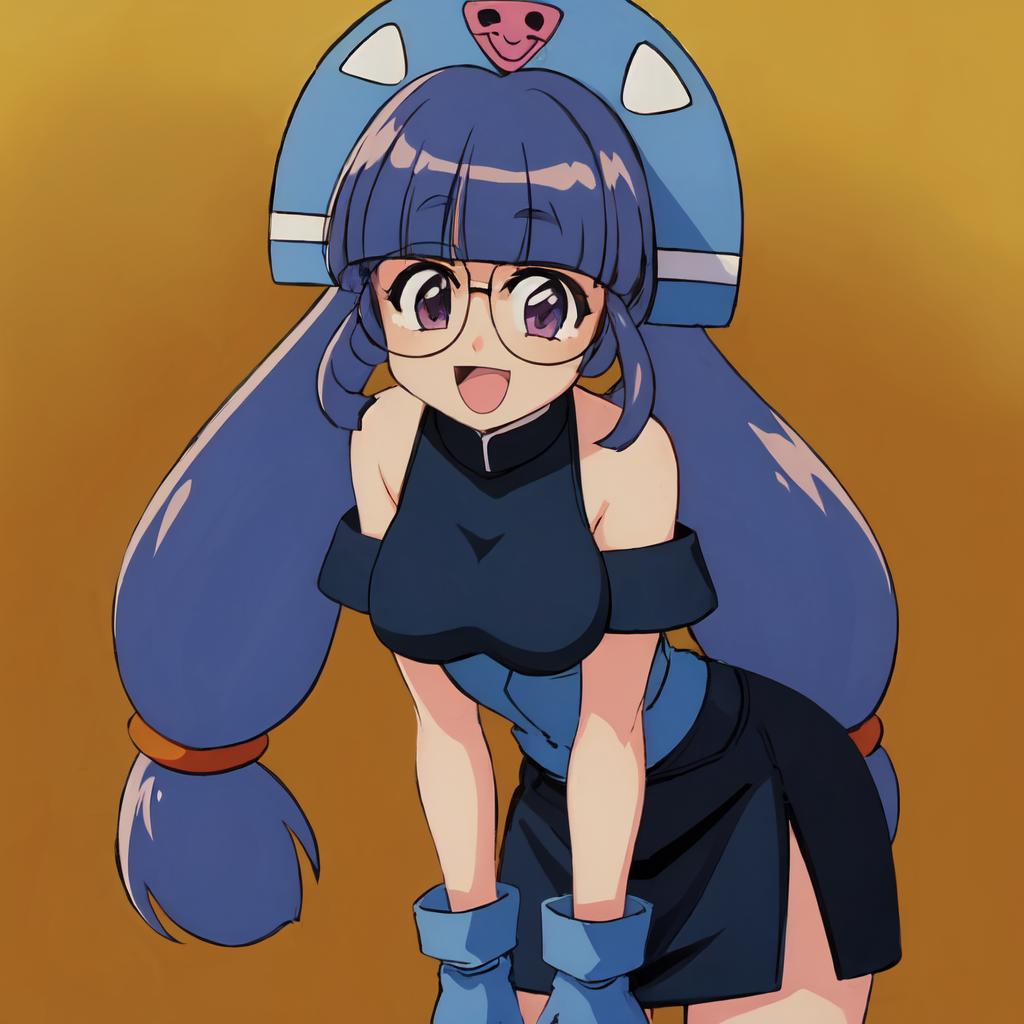 orange helmet, blue headwear, glasses, purple hair, twintails, low-tied long hair, zettai ryouiki, thigh boots, purple eyesTrained using NAI