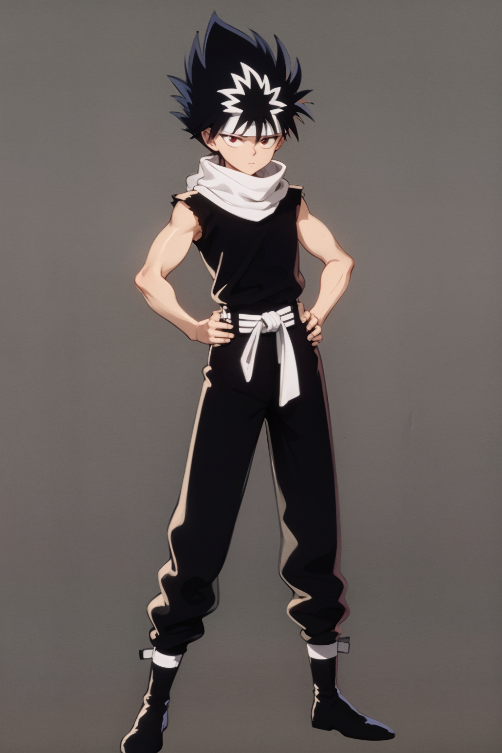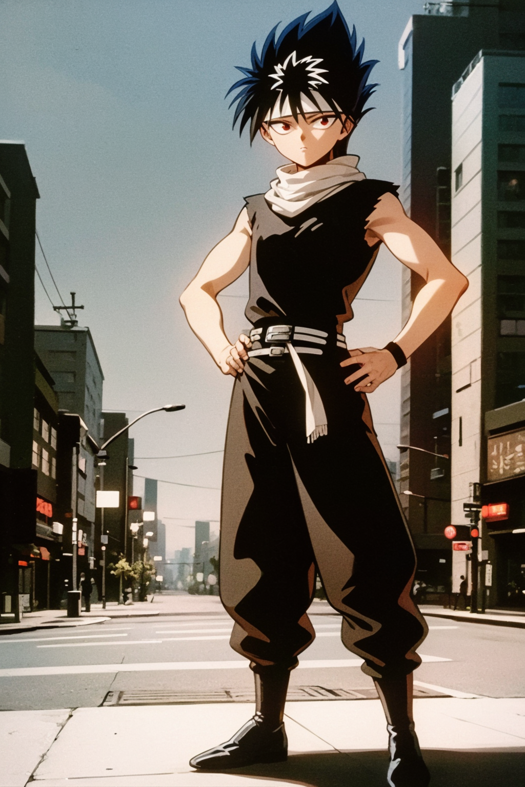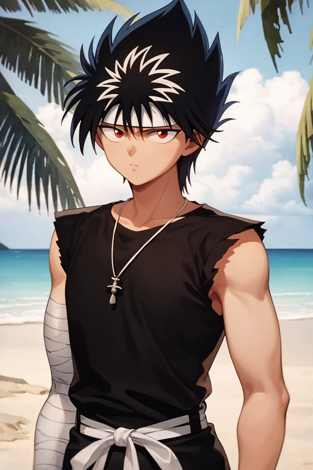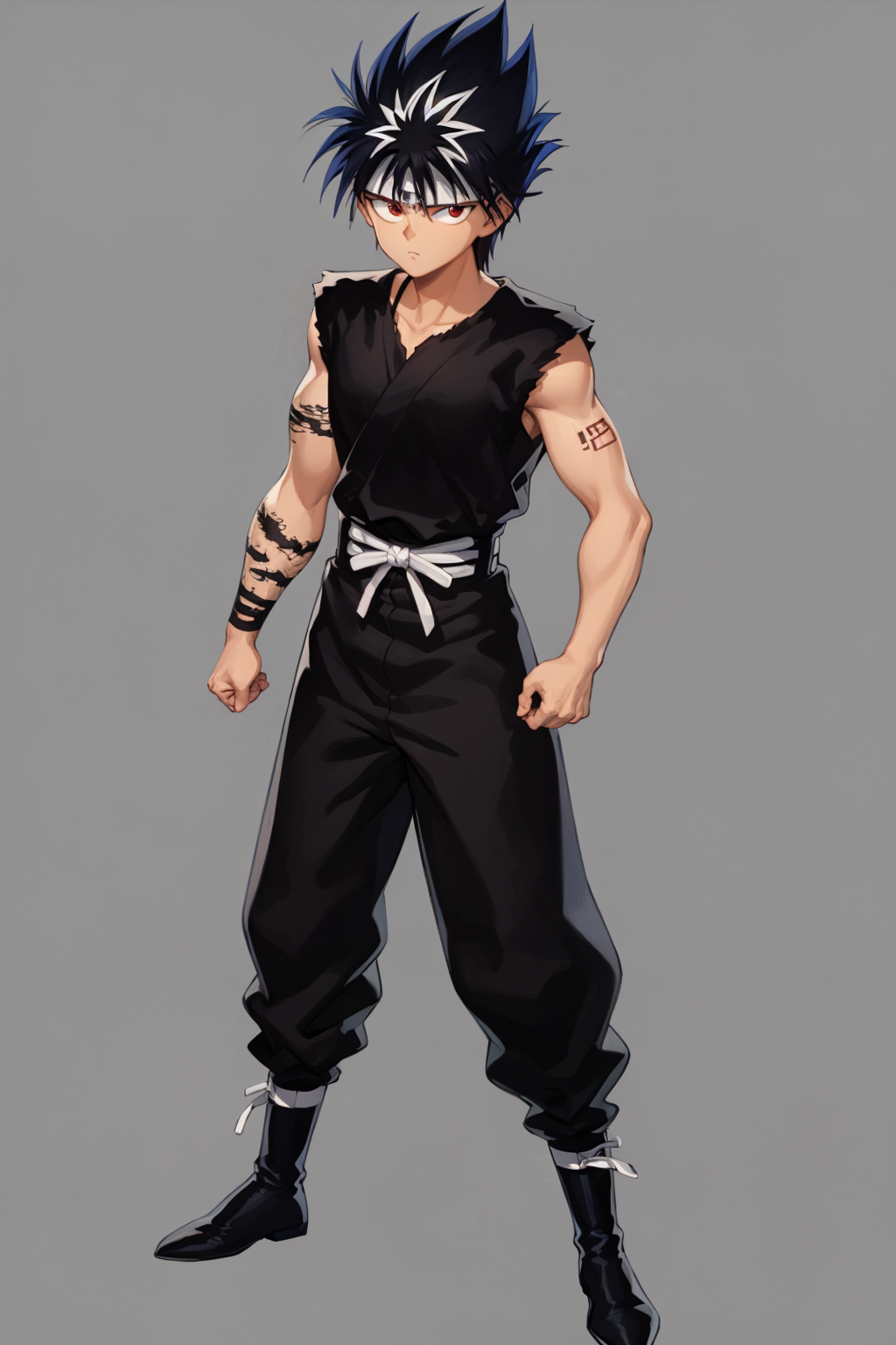 Sleeveless outfit prompts : belt, black footwear, sleeveless, torn clothes, bandages