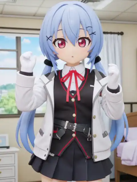 sample prompt:Hakase Huyuki, anime-style girl. The image features an anime-style character The image features an anime-style character with light blue hair styled in twin pigtails. The character has large, expressive red eyes that stand out prominently against their pale skin.The character's clothing consists of a dark-colored outfit with white accents. The outfit includes a high-collared shirt with a white collar and cuffs, and a black vest adorned with red trim and a decorative bow at the waist and is wearing a white blouse with a brown vest over it. The blouse has a red ribbon tied around the neck and a white collar.The character is wearing a school uniform consisting of a white blouse with a red ribbon tie, a brown vest.She is wearing a white cardigan. The character also wears white gloves.The character's skirt is black and pleated, complementing the overall monochrome theme of the attire. (she is dancing:4.0), (chibi Nendoroid:4.5) in bedroom.