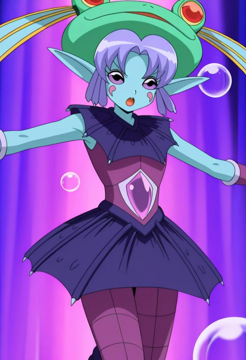 darkus elfin, solo, pointy ears, colored skin, purple eyes, hat, open mouth, purple hair,purple skin