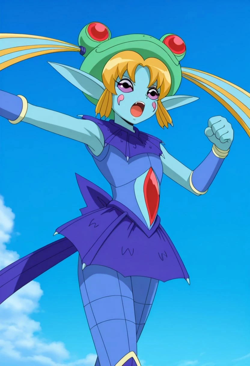 aquos elfin, pointy ears, blue skin, solo, 1girl, blonde hair, colored skin