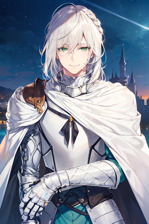 white armor, breastplate, white gautnlets, white cape