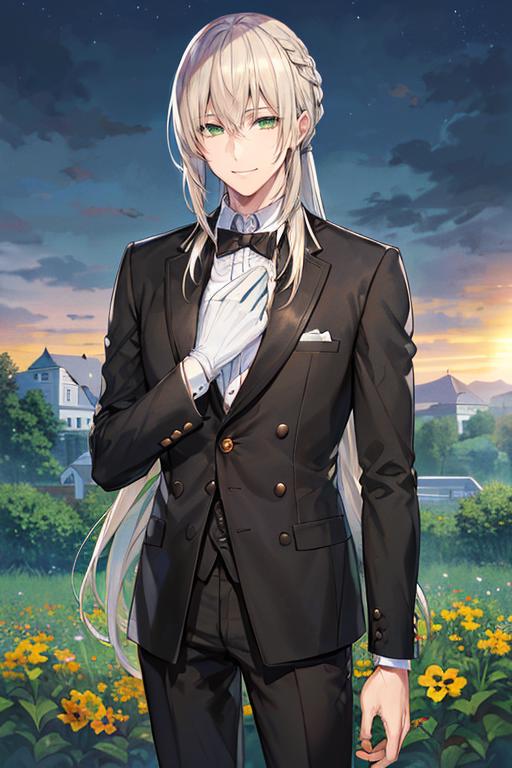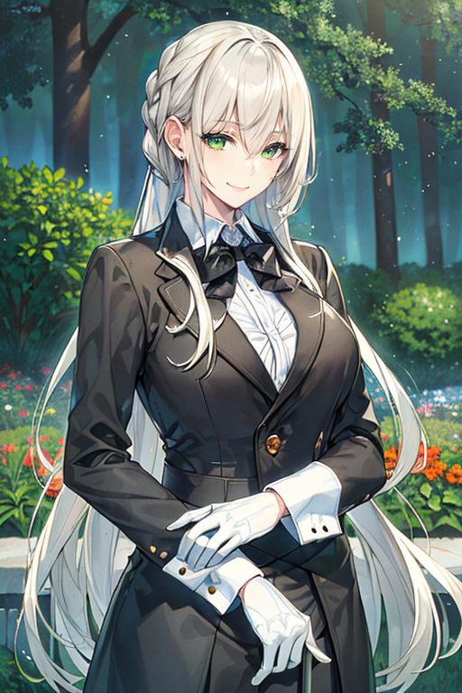 white hair, long hair, green eyes