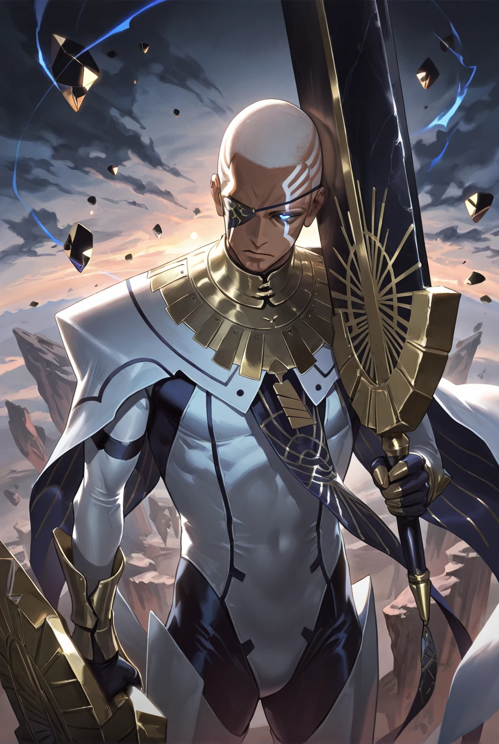 white hair , ( bald ) , dark-skinned ( male ) , blue eyes ;